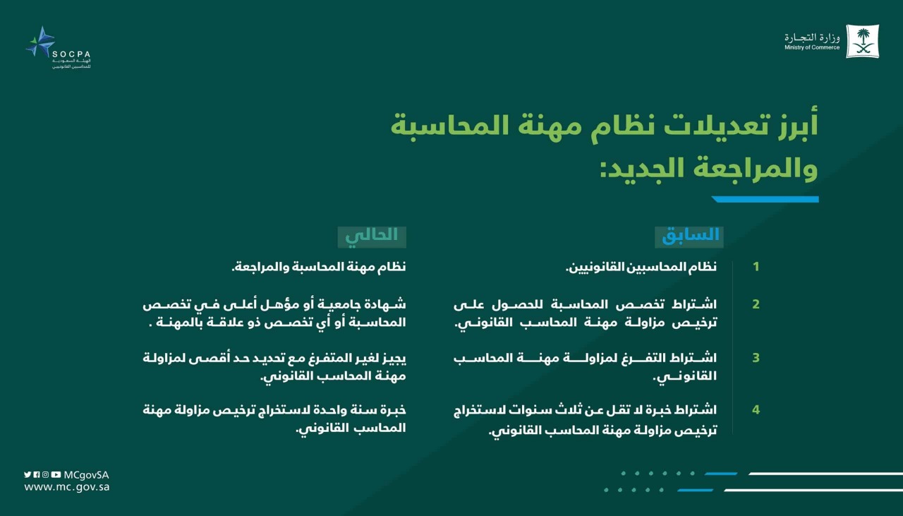 وقد جاء نظام مهنة المحاسبة والمراجعة الجديد في (22) مادة نظمت كافة جوانب المهنة وقد تناولت ورشة العمل إلقاء الضوء على أهم هذه الموادومنها المادة الأولى: وتناولت تغيير مسمى الهيئة السعودية للمحاسبين القانونيين إلى الهيئة السعودية للمراجعين والمحاسبين، وأن المحاسب القانوني هو شخص ذو صفة طبيعية أو اعتبارية مرخص له بمزاولة المهنة. وقد أكدت المادة الثانية على عدم إمكانية مزاولة المهنة إلا بعد الحصول على الترخيص وفقاًلأحكام النظام. وفي المادة الثالثة تم تحديد شروط الحصول على الترخيص ومنها أن يكون طالب الترخيص سعودي الجنسية، وكامل الأهلية، وحاصلاًعلى الشهادة الجامعية أو أي مؤهل أعلى في تخصص المحاسبة أو أي تخصص بالمهنة وفقا ًللمعايير التي تحددها اللائحة، أن يكون عضواًأساسيا ًفي الهيئة ولديه خبرة في طبيعة العمل لا تقل عن سنة. وأن يكو حسن السيرة والسلوك.