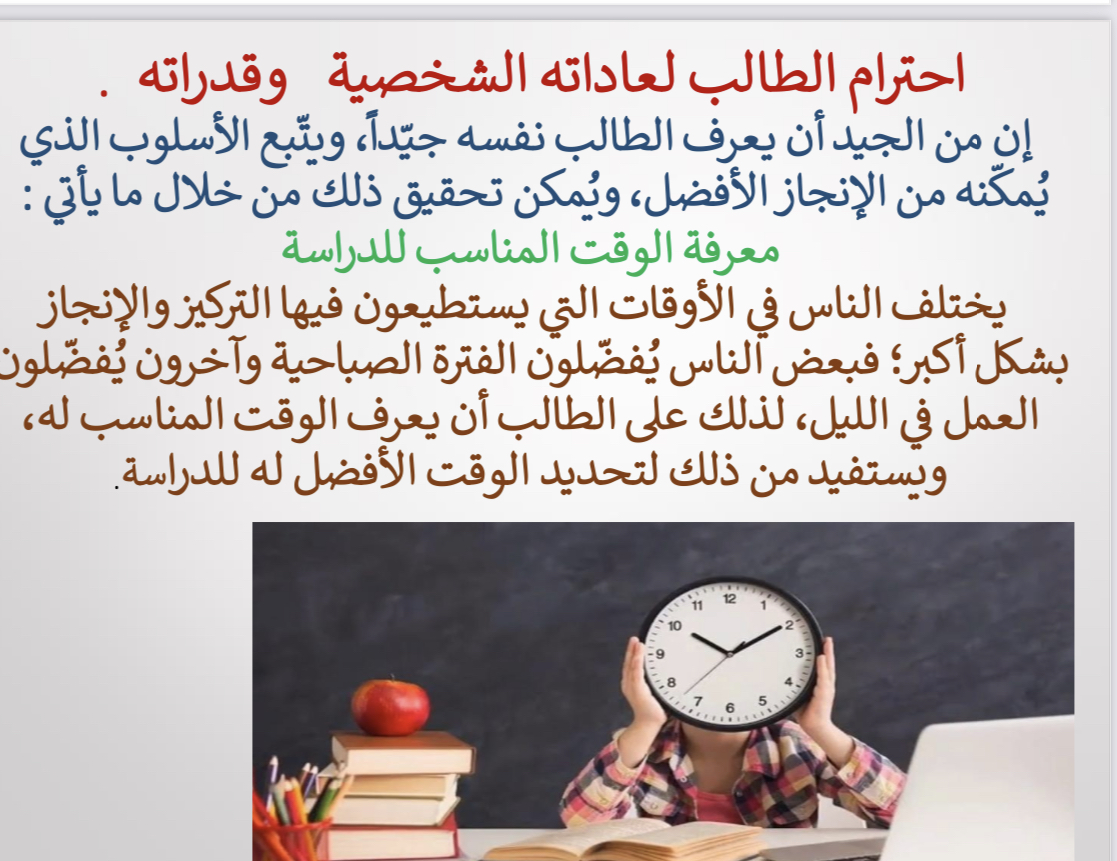 نظم المجلس الاستشاري للطالبات بكلية الاداب والعلوم بوادي الدواسر يوم الاحد الموافق ١٢/٤/١٤٤٤ دورة تدريبية بعنوان الاستعدادات للاختبارات وذلك برعاية كريمة من سعادة عميد الكلية الدكتور سلطان بن ال ربيع والدكتورة فارعة عبد الله الخزاعي وتحت اشراف منسقة المجلس الطلابي الدكتورة غادة طه حيث بدأت الدورة في الثانية عشر مساءًا بمسرح الكلية وتضمنت علي توجيه الطالبات الي اساس النجاح والتفوق وهو ١- التوكل علي الله ٢- التخطيط ٣- العمل ٤- الصبر وايضا تقديم العديد من النصائح المتعددة للطالبات منها طريقة الاستذكار والاستعداد الجيد في كل مقرر قبل الاختبارات وتم اعداد ملف كامل لهذه الدورة وارساله الي جميع الطالبات بجميع الاقسام حتي يتثني لهن الاستفادة من الدورة اذا لم يستطعن الحضور المباشر للدورة وذلك للحصول علي الاهداف المطلوبة من الدورة وهو وصول شعور الهدوء والطمأنينة لجميع الطالبات اثناء تأدية الاختبارات وقامت طالبات المجلس بالاعداد للدورة بشكل جيد ورائع وعلي راسهم الطالبه كايدة شارع التي القت الدورة بشكل منظم ورائع.