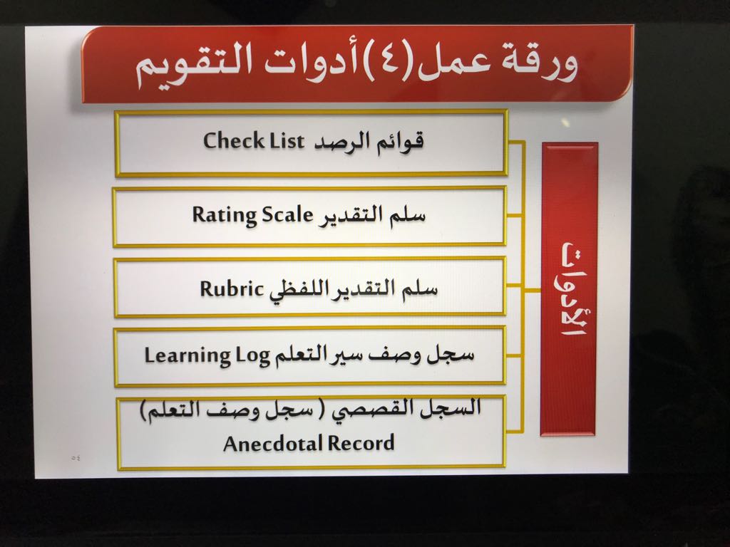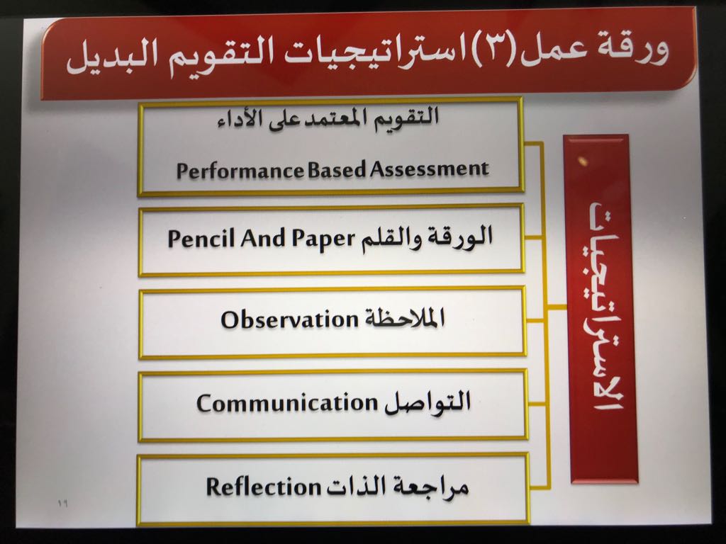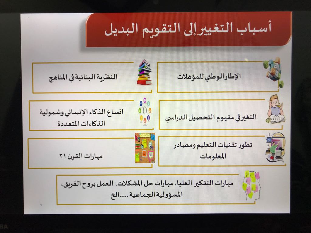 كان الهدف منها التعرف على الرؤية الجديدة للتقويم ، وتحديد الأدوار الجديدة لعضو هيئة التدريس في التقويم من أجل التعلم ،وتصميم نماذج لأدوات التقويم البديل ، وتطبيق أساليب التقويم البديل في مجال التخصص، ومن ثم تطرقت المدربة إلى عدة محاور تضمنت