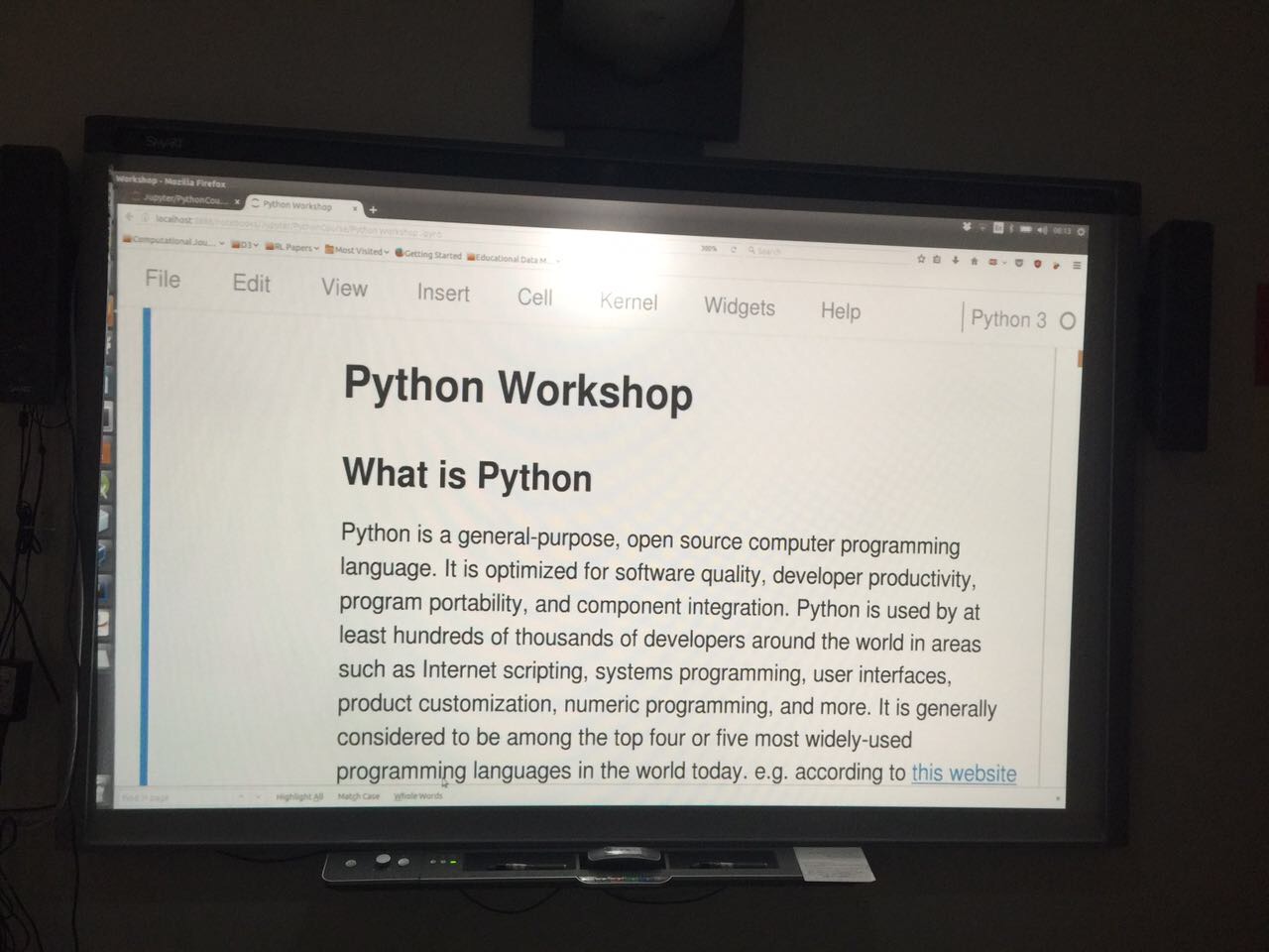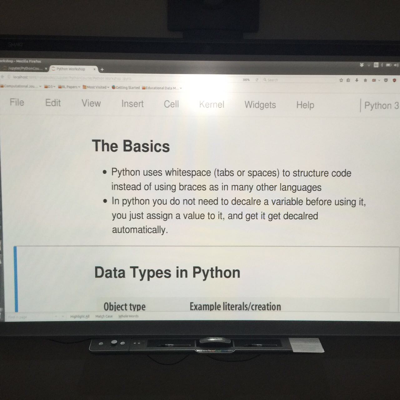 python وذلك يوم الأحد الموافق ٦-٦- ١٤٣٨ للدكتورة / عائشة عبدالله ، حيث هدفت هذه الورشة إلى تعريف الطالبات بهذه اللغة على أنها من لغات البرمجة عالية المستوى والتفاعلية ،حيث يمكن تشغيل مفسر بايثون وكتابة الأوامر ورؤية النتائج والتفاعل معه فورا كما أنها كائنيه التوجه مفسره أي يمكن تنفيذ الكود المكتوب مباشرة بدون الحاجه لعمل compile وذلك باستدعاء المفسر كما وتم تعريفهم بأهم ما يميز بايثون وهي بساطتها وسهولة تعلمها ، وأنها تعمل على العديد من المنصات وهذا يعني ان المستخدم لن يحتاج لتغيير الكود ليعمل على نظام تشغيل آخر وتم تطبيق العديد من الأمثلة التطبيقية على البرنامج .