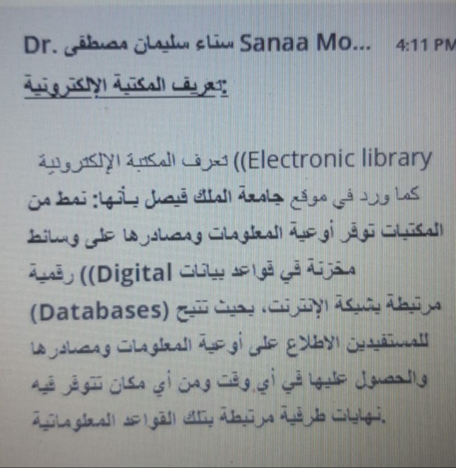 تطرقت لتوضيح مفهوم المكتبات الرقمية وتعريفها، ووضحت أسماء اشتهرت بها ) المكتبة الإلكترونية- الافتراضية – مكتبة بلا جدران – المكتبة الرقمية). ووضحت للطالبات أهمية هذه المكتبات والخدمات التي تقدمها.