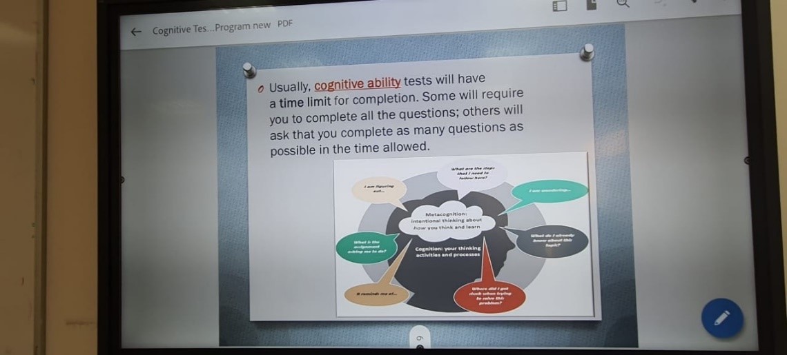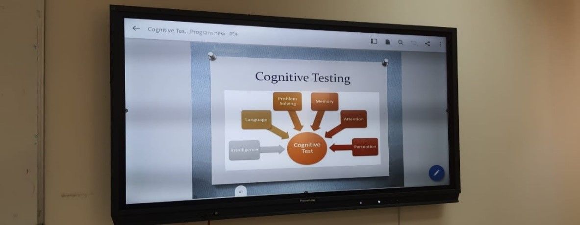 قد كانت ورشة العمل تفاعلية، حيث عرضت الأستاذة أهمية المقارنة بين الاختبارات المعرفية والتحصيلية وانعكاساتهما في بيئة التدريس، أهمية المهارات المعرفية التي تتناول مجموعات من العمليات العقلية، بما في ذلك الذاكرة وحل المشكلات، واتخاذ القرار، والتعلم والانتباه.