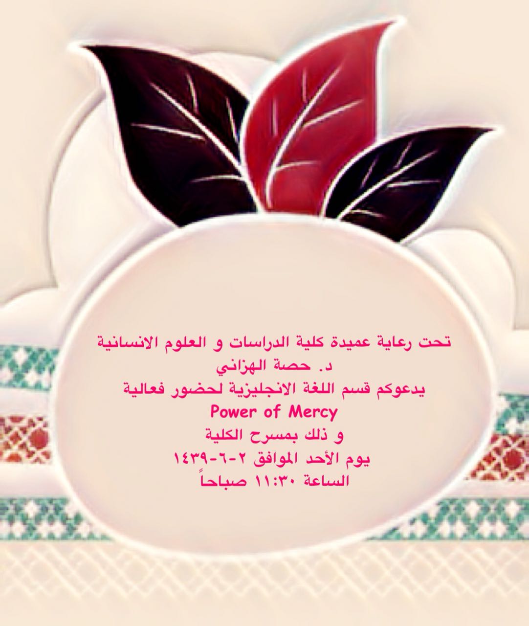 تحت مظلة كلية العلوم والدراسات الإنسانية بحوطة بني تميم وبإشراف عميدتها الدكتورة حصة بنت سعود الهزاني، أقام قسم اللغة الانجليزية بمسرح الكلية (Power of Mercy) يوم الأحد 2 / 6 / 1439 هـ بمسرح الكلية عند الساعة العاشرة صباحاً. هدفت الفعالية إلى توجيه رسالة تدعوا إلى غرس قيم الخير والأخوة وحب العطاء في القلوب.