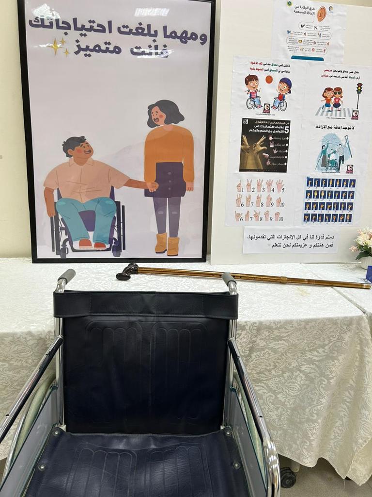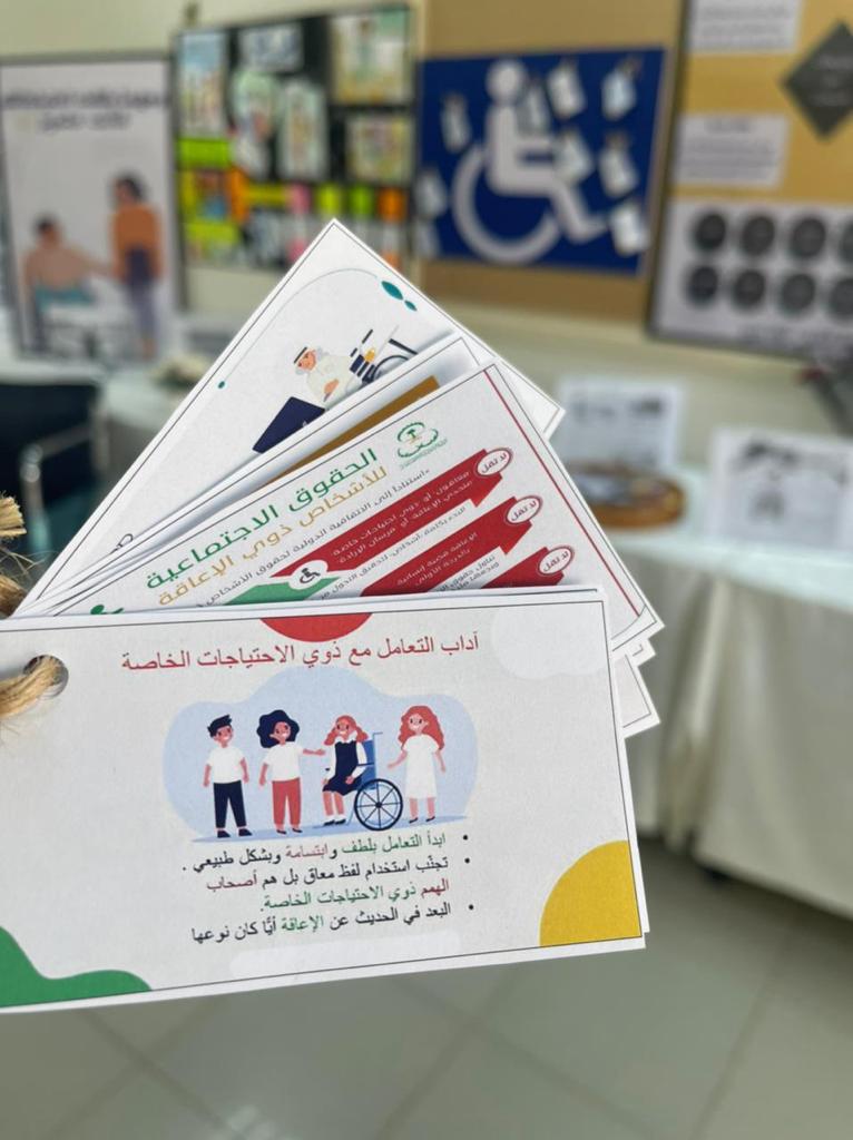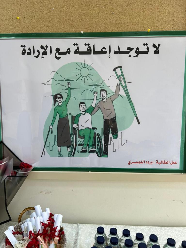 شاركت الطالبات في المعرض من خلال تقديم عروض عن أنواع الأعاقات، وأشكالها سواءً جسدية أو عقلية، وعرض لوحات تثقيفية توضح آداب التعامل مع هذه الفئة، و التعريف بحقوقهم على مختلف المستويات.