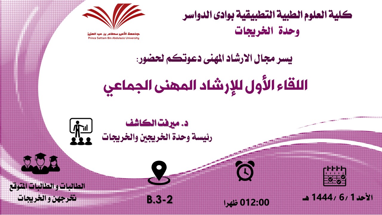 قامت وحدة الخريجين و الخريجات بكلية العلوم الطبية التطبيقية بوادي الدواسر تحت إشراف د. ميرفت الكاشف ممثلة بمجال الإرشاد المهني بعقد اللقاء الإرشاد المهني للطالبات في يوم الأثنين الموافق 1444/6/2هـ ويوم الخميس1444/6/5هـ للطلاب قدمته دكتورة ميرفت الكاشف وكان اللقاء موجهة إلى الخريجين و الخريجات و الطلاب و الطالبات و المتوقع تخرجهم و كان هدف الدورة هو إلقاء الضوء على أهم صفات الخريج و مسارات التخرج و الوظائف المتاحة للخريج و كيفية التواصل مع الجهات التوظيفية بالإضافة إلى كيفية التقديم على الدراسات العليا و الأدلة واللوائح المطلوبة لذلك