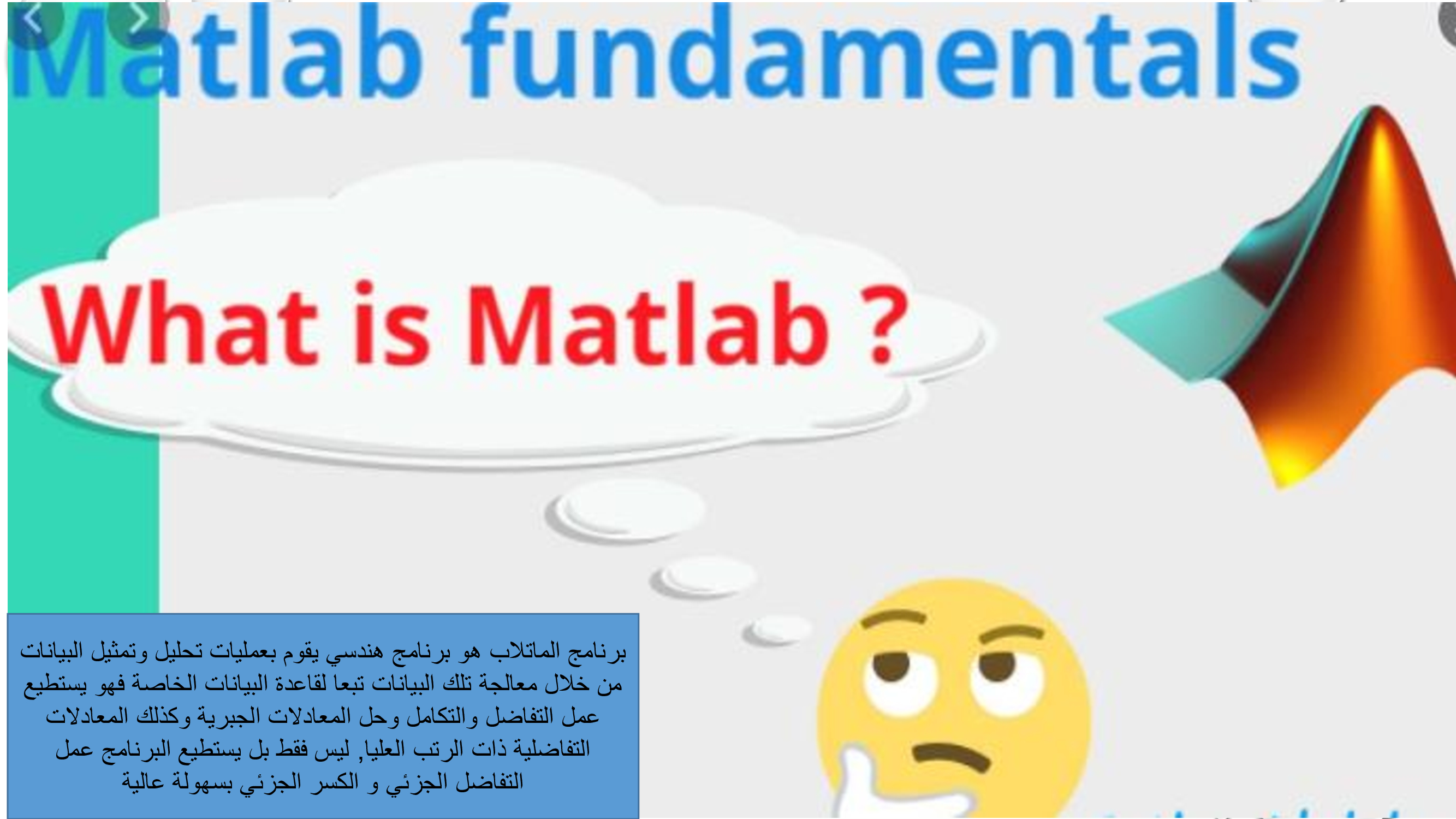 1. التعريف علي برنامج الماتلاب والنوافذ الأساسية للبرنامج 2. كيفية استخدام البرنامج في العمليات الحسابية والدوال المثلثية 3. كيفيةأستخدام البرنامج في اجراء التفاضل والتكامل والتعامل مع المصفوفات 4. كيفية أستخدام البرنامج في الرسم الرياضي 5. التعرف عليالتطبيقات المختلفة لبرنامج الماتلاب