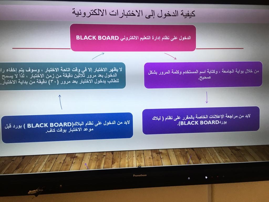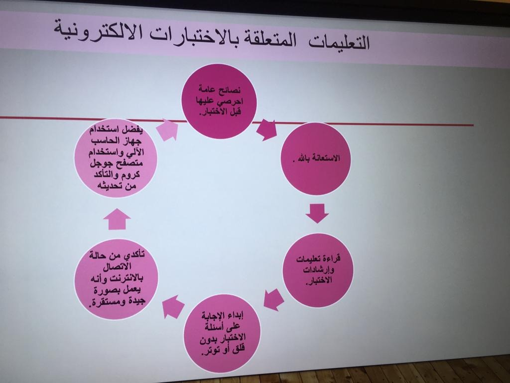والتي بدورها تناولت خلال العرض التعريف بالاختبارات الإلكترونية، وأهميتها وأنواع الاختبارات الإلكترونية وكيفية دخول الطالبة على الاختبار وكيفية حفظ وارسال الإجابة، ثم انتقلت إلى عرض نماذج تدريبية لأنواع الاختبارات الالكترونية، ثم قدمت التعليمات الأساسية التي يجب على عضوات هيئة التدريس تنبيه الطالبة بها ضمن إرشادات الاختبار.
