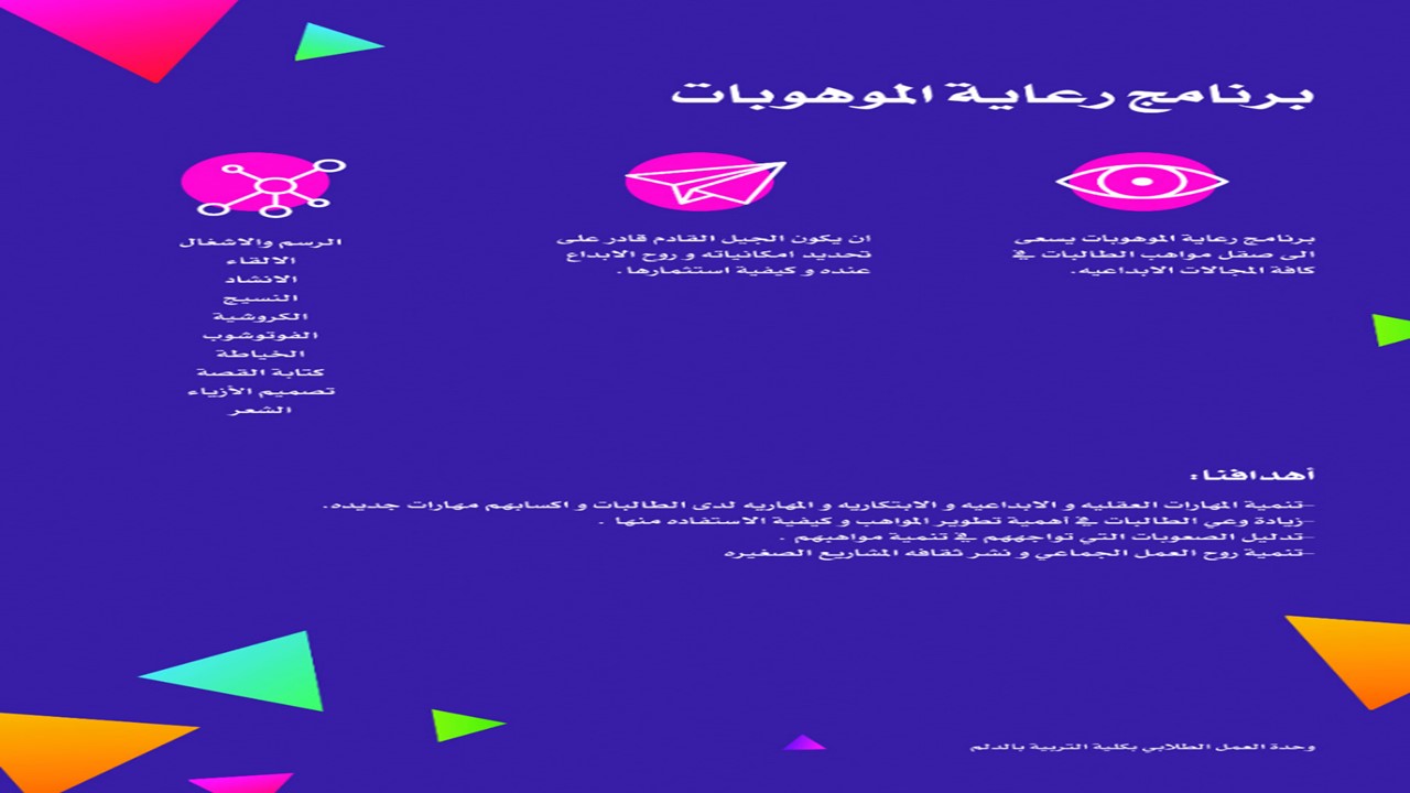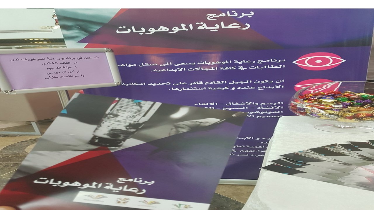 في إطار حرص كلية التربية بالدلم على رعاية الموهوبات التي تعد من أكثر اهتمامات رؤية المملكة العربية السعودية (2030) دشن قسم الاقتصاد المنزلي بالتعاون مع وحدتي العمل الطلابي والخريجات بالكلية برنامج رعاية الموهوبات يوم الأثنين 3/2/1439هـ والذي يستهدف طالبات الجامعة وخريجاتها , ويقوم على البرنامج نخبة من عضوات هيئة التدريس بقسم الاقتصاد المنزلي تخصص الملابس والنسيج والتربية الفنية وعضوات من قسم اللغة العربية وتشرف على تنفيذه رئيسة لجنة رعاية الموهوبات الدكتورة عفاف الخالدي ,ويشمل البرنامج دورات وورش تدريبية في عشرة مجالات وهي :