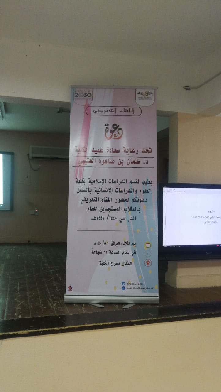 نظم قسم الدراسات الإسلامية بكلية العلوم والدراسات الانسانية بالسليل تحت رعاية سعادة عميد الكلية د. سلمان العتيبي لقاءاً تعريفياً بطلاب القسم المستجدين للعام الدراسي ١٤٤١ه يو الثلاثاء الموافق ١١ /١ حيث في البداية رحب رئيس القسم د. حسن المسعودي بالطلاب المستجدين ثم تحدث د. فليان السبيعي وكيل الكلية للدراسات العليا والجودة عن أهمية التعلم والاجتهاد والمثابرة في ذلك وبعدها استعرض رئيس القسم الخطط الدراسية في القسم وبعض التعليمات الأكاديمية العامة .