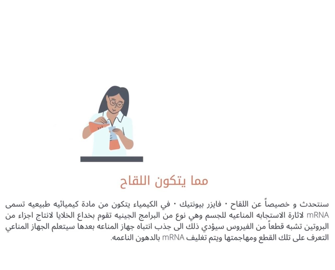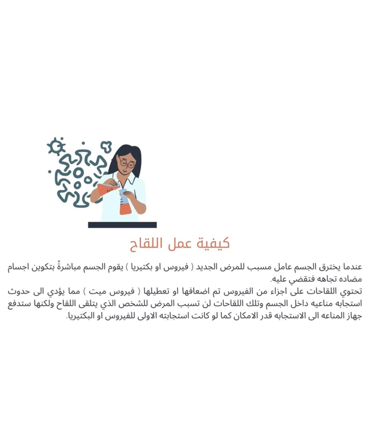وقد تضمنت هذه المحاضرة عرض تقديمي عن: الكيمياء واللقاح مكونات اللقاح، كيفية عمل اللقاح داخل الجسم، نسب تلقي اللقاح في المملكة العربية السعودية، الإرشادات العامة والنصائح .