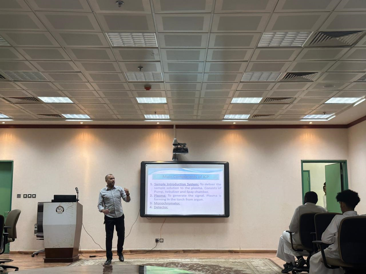 في البداية رحب رئيس قسم الكيمياء د. عبد العزيز عبد الحميد العنزي بالطلاب والطالبات الحضور وأكد على ضرورة حضور مثل هذه الدورات، وبعد ذلك قام الدكتور هاني بشرح لجهاز ICP-OES وجهاز IEC ولقد تضمن الشرح النقاط الأتية: