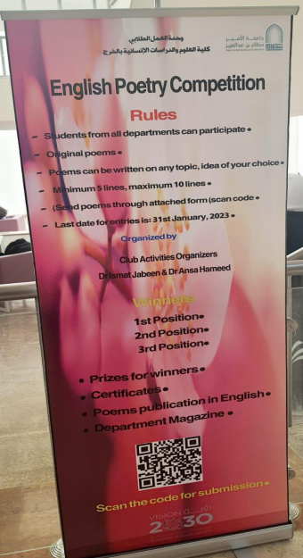 أقام قسم اللغة الإنجليزية في وحدة العمل الطلابي بكلية العلوم والدراسات الإنسانية بالخرج (أقسام الطالبات) مسابقة كتابة الشعر باللغة الإنجليزية في 31 يناير 2023 وذلك لتزويد الطالبات من جميع الأقسام في الكلية بفرصة لعرض إبداعاتهن الشعرية باللغة الإنجليزية.