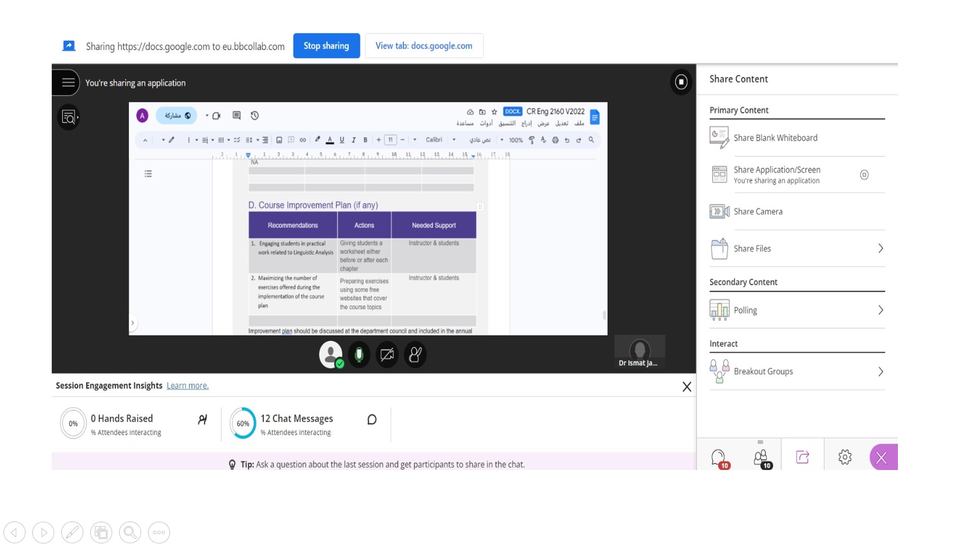فقد تم البدء بالترحيب بالحضور والاعضاء الجدد وتقديم نبذة عن القسم وعرض الخطة الدراسية والتعريف بصفحة الجامعة والخدمات الالكترونية المتاحة، كما تم تقديم فقرة عن أساسيات استخدام البلاك بود مثل ارسال الإعلانات والواجبات للطالبات.