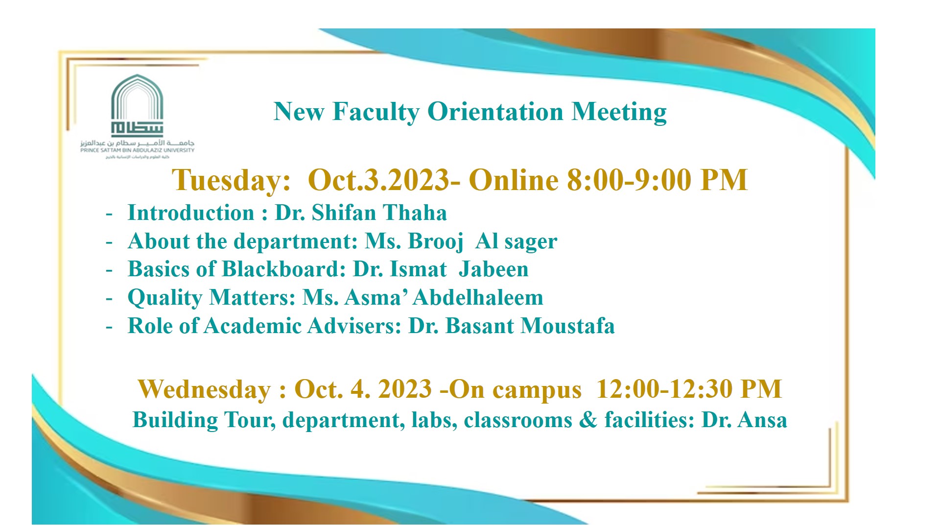 أقامت لجنة التطوير والجودة بقسم اللغة الإنجليزية في كلية العلوم والدراسات الإنسانية بالخرج (أقسام الطالبات) اللقاء التعريفي بالأعضاء الجدد على مدى يومين الثلاثاء والأربعاء 3-4/10/2023م حيث قدمت لجنة الجودة الفعالية مساء يوم الثلاثاء عبر منصة البلاك بورد.