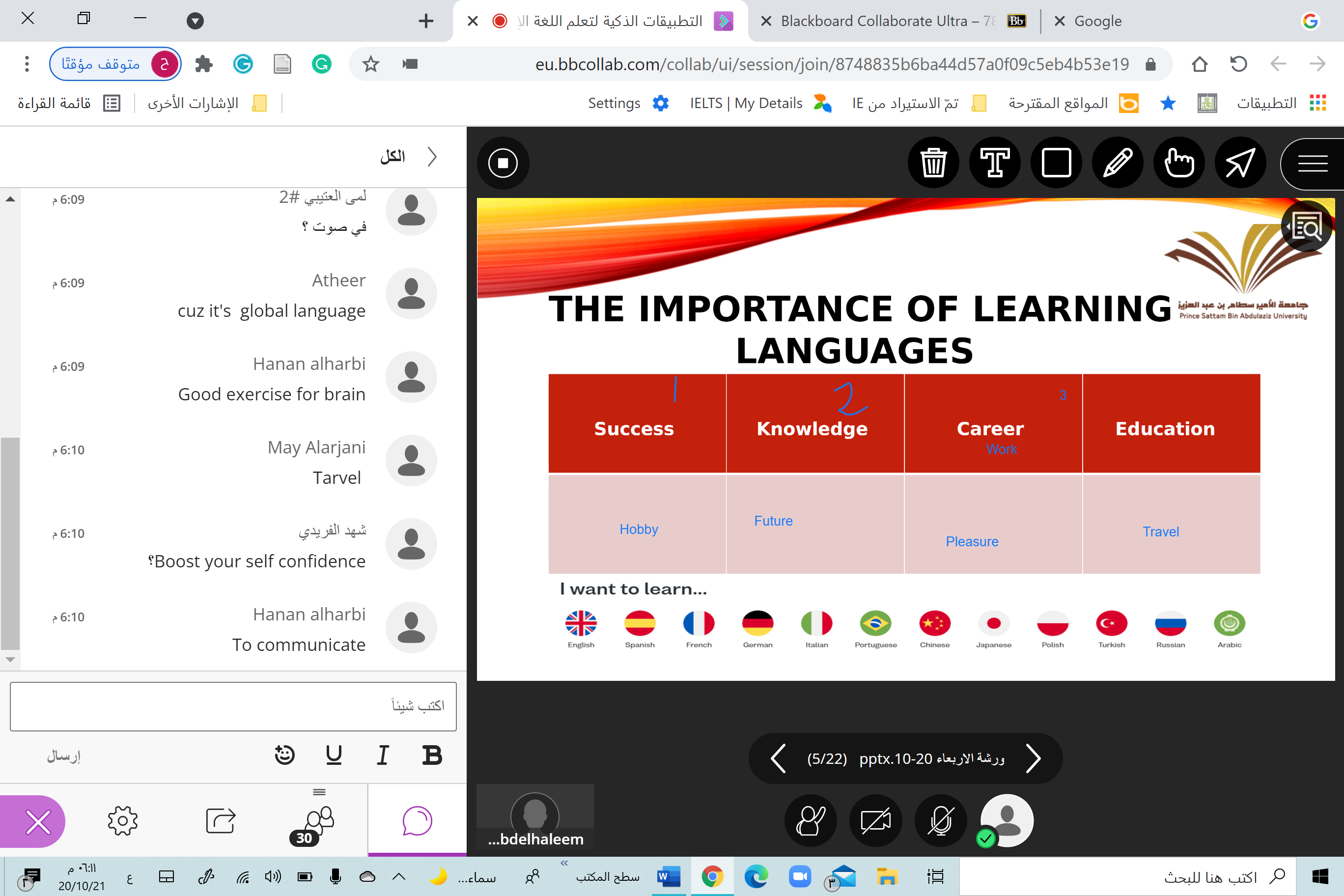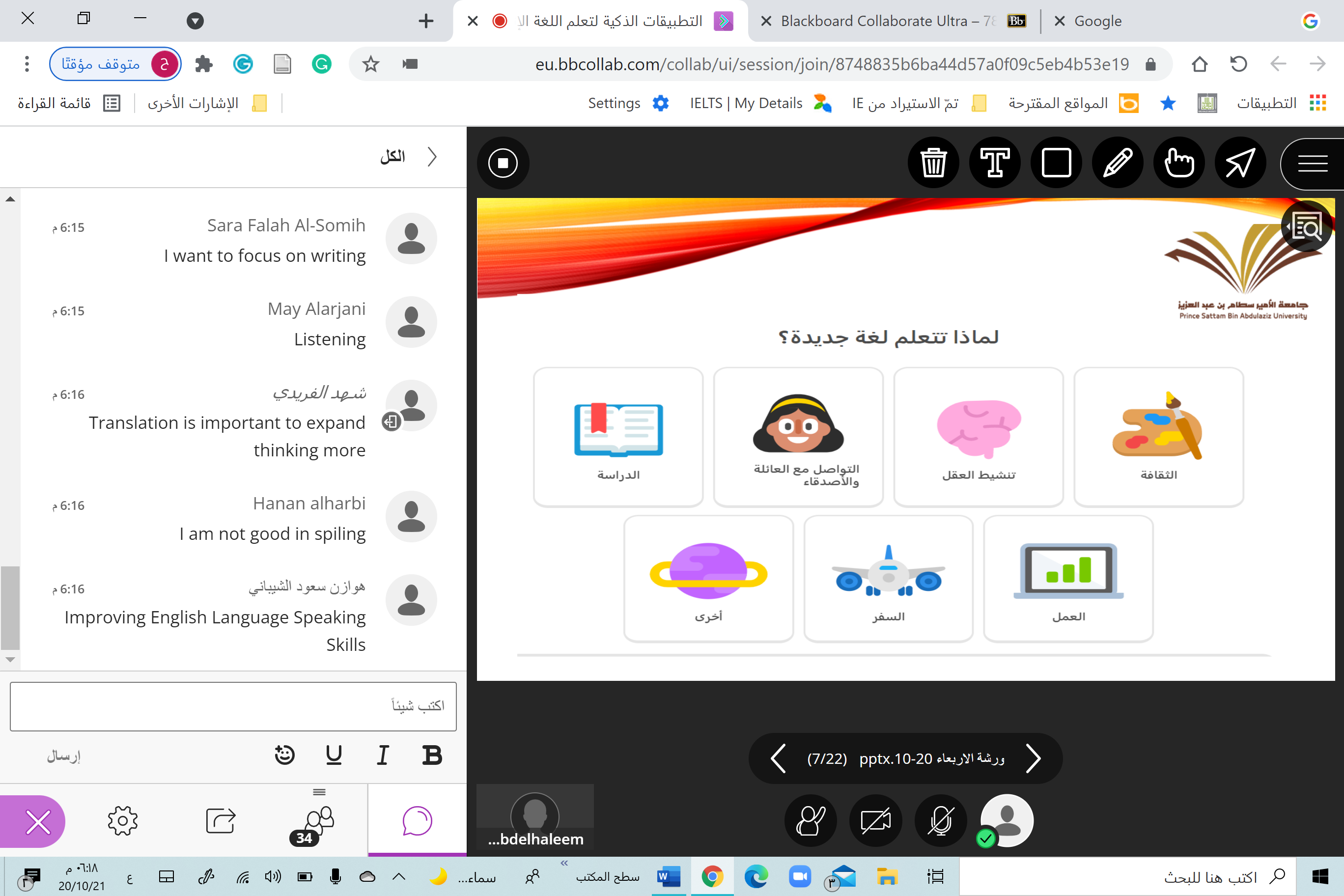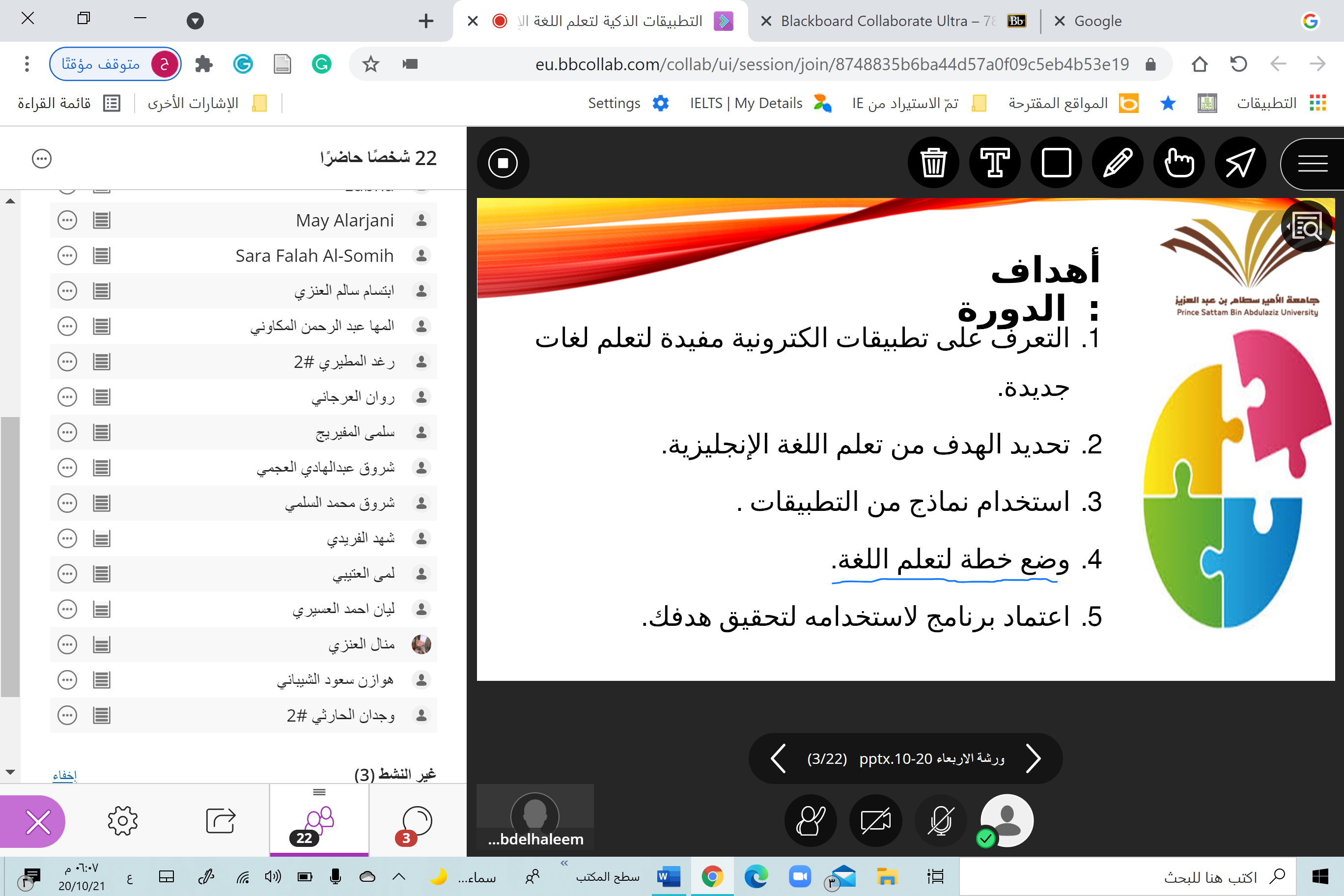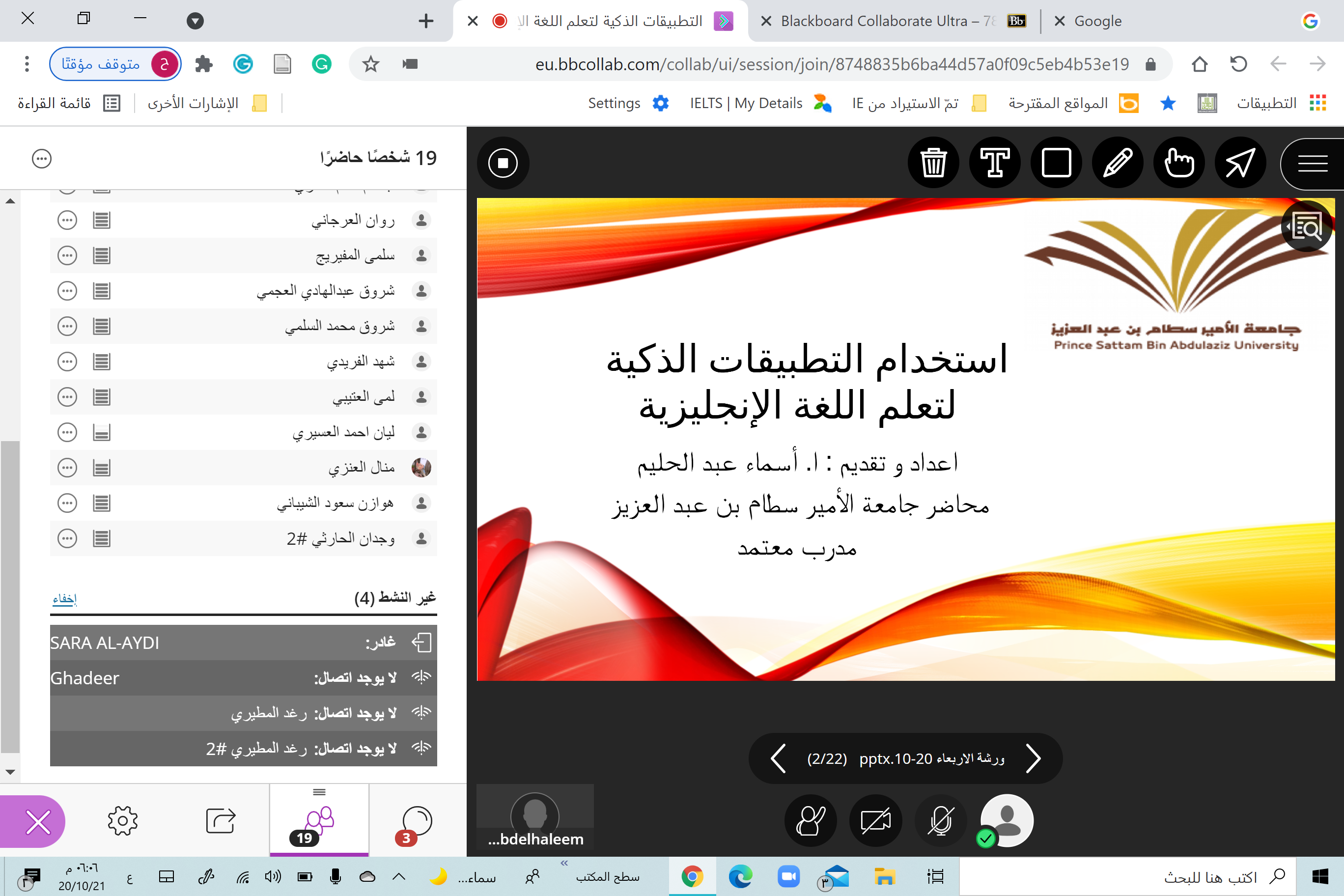 أقام قسم اللغة الانجليزية في كلية العلوم والدراسات الإنسانية بالخرج (أقسام الطالبات) متمثلًا بوكيلة القسم الدكتورة ايمان النبوي ورشة بعنوان (استخدام التطبيقات الذكية لتعلم اللغة الانجليزية) عن بعد وذلك يوم الأربعاء الموافق ٢٠-١٠-٢٠٢١م حيث قدمتها الأستاذة أسماء عبد الحليم وبإشراف الأستاذة حنان الشهاب.