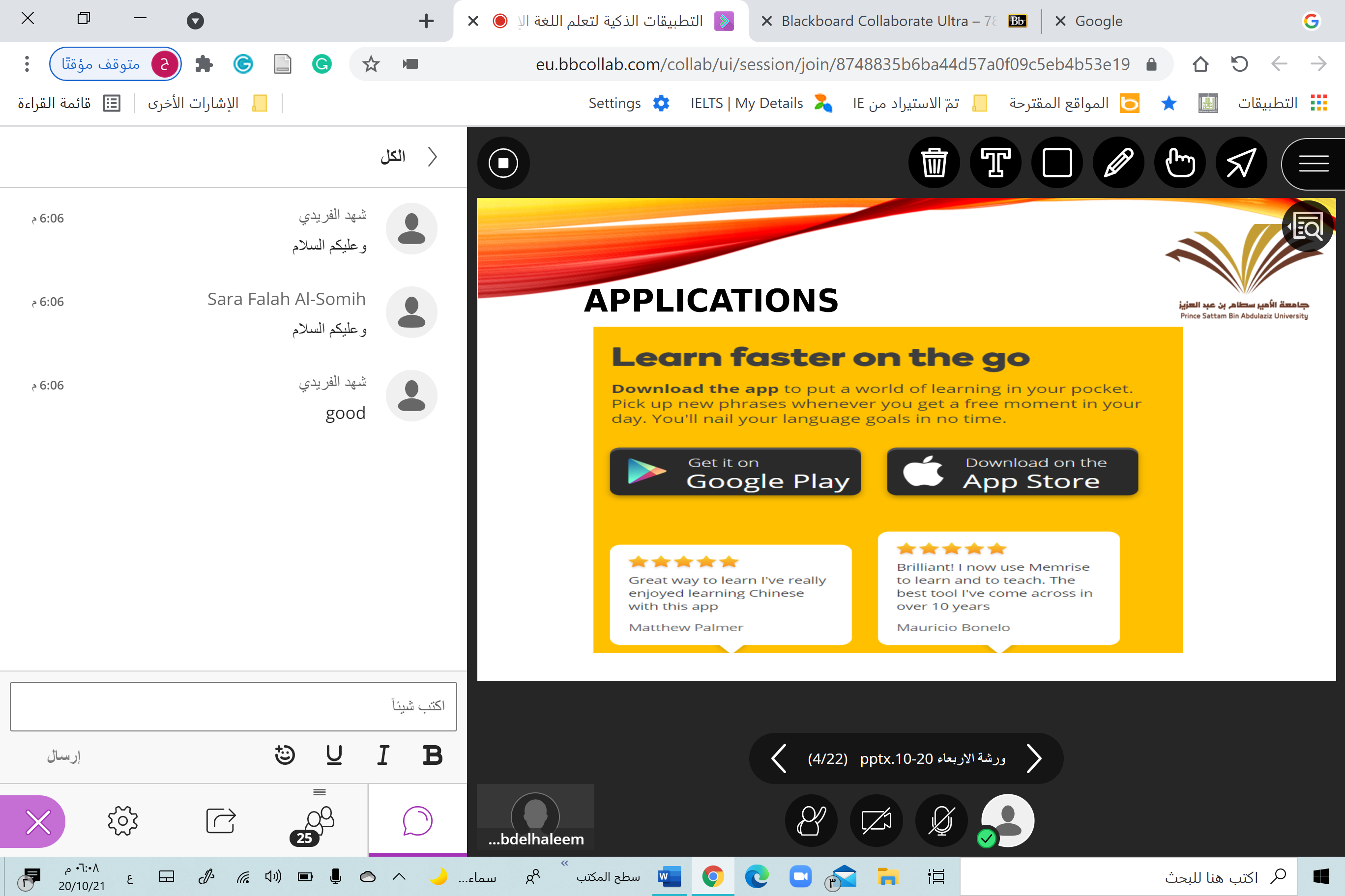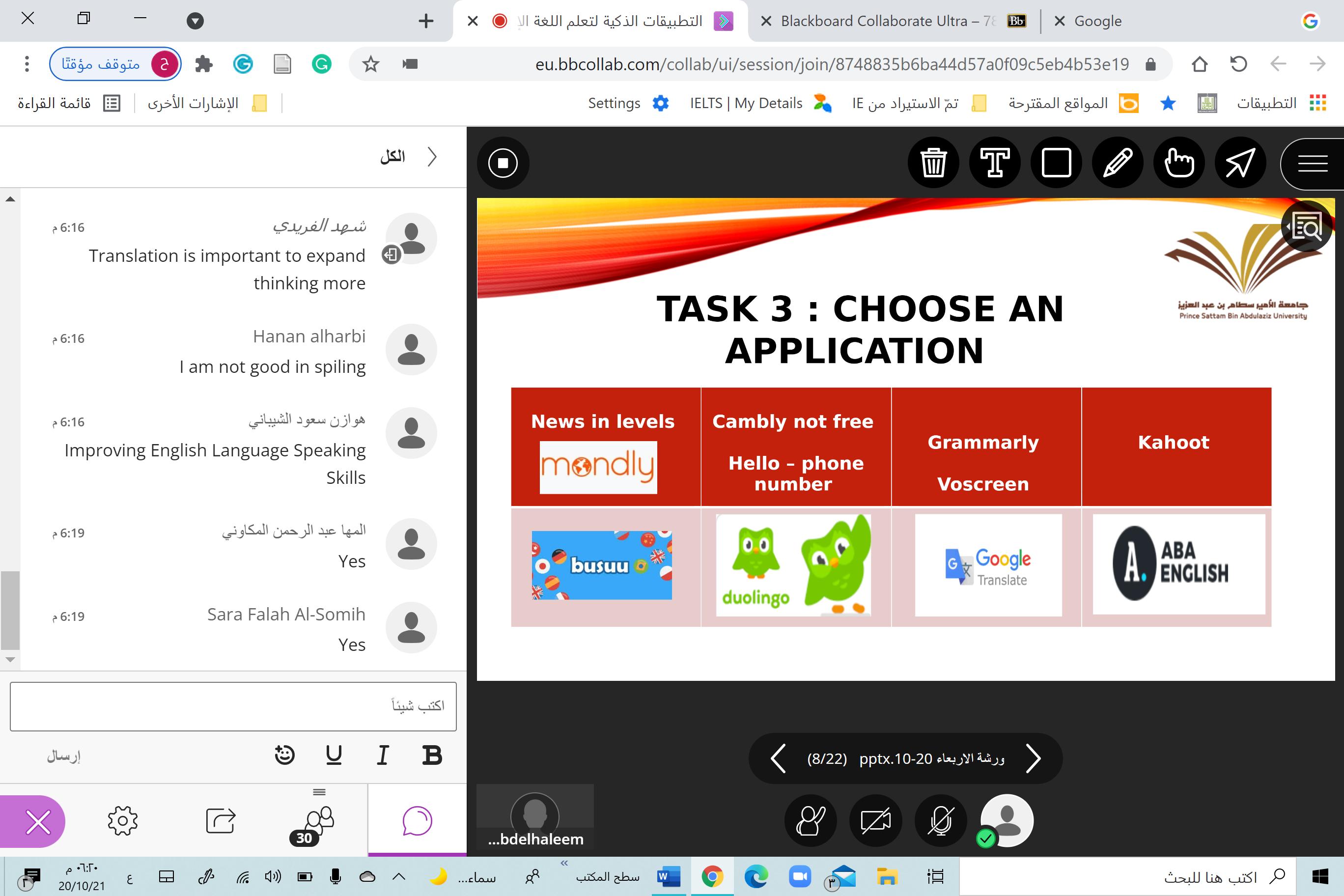 كانت الورشة تتمحور حول استخدام التطبيقات بطريقة فعالة لتعلم اللغة وتم تدريب الطالبات على طريقة استخدامها والاستفادة القصوى منها حيث تطور مهارات الكتابة والقراءة وكذلك التحدث والاستماع، وتم ايضًا عمل بعض التمارين والاجابة عليها مما يعزز ثقة الطالبات في استخدام هذه التطبيقات.
