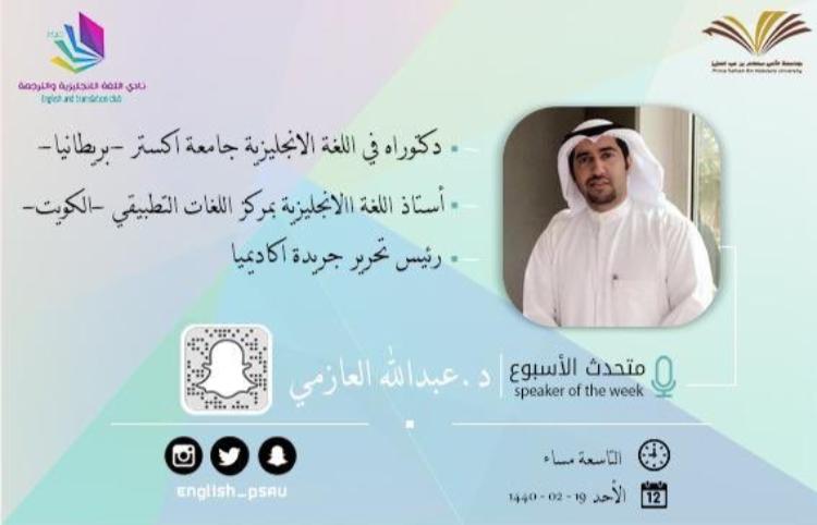- ففي يوم الأحد 19/2/1440هـ استضافت لجنة نادي اللغة الإنجليزية والترجمة بالقسم الدكتور عبد الله العازمي رئيس تحرير جريدة أكاديميا وأستاذ اللغة الإنجليزية بمركز اللغات التطبيقي بدولة الكويت على سناب شات النادي @english_psau كجزء من الاستضافات التي يقوم بها النادي فقد تحدث الدكتور عن خصائص المترجم المحترف البليغ في اللغتين المصدر والهدف.