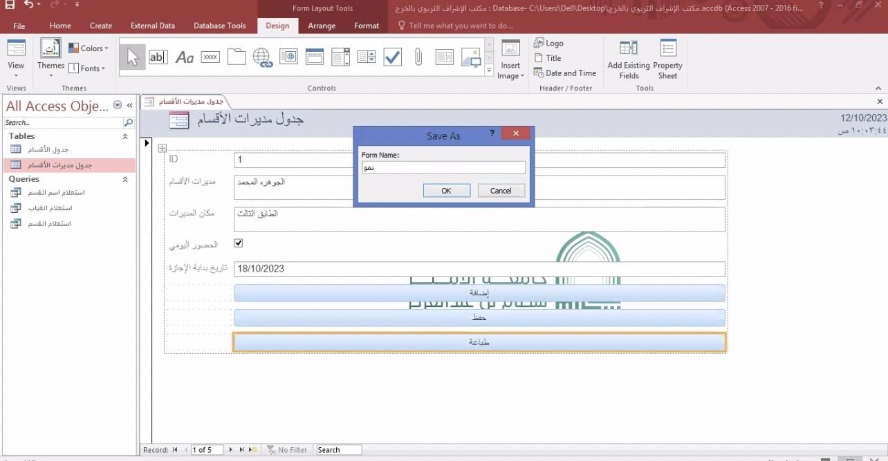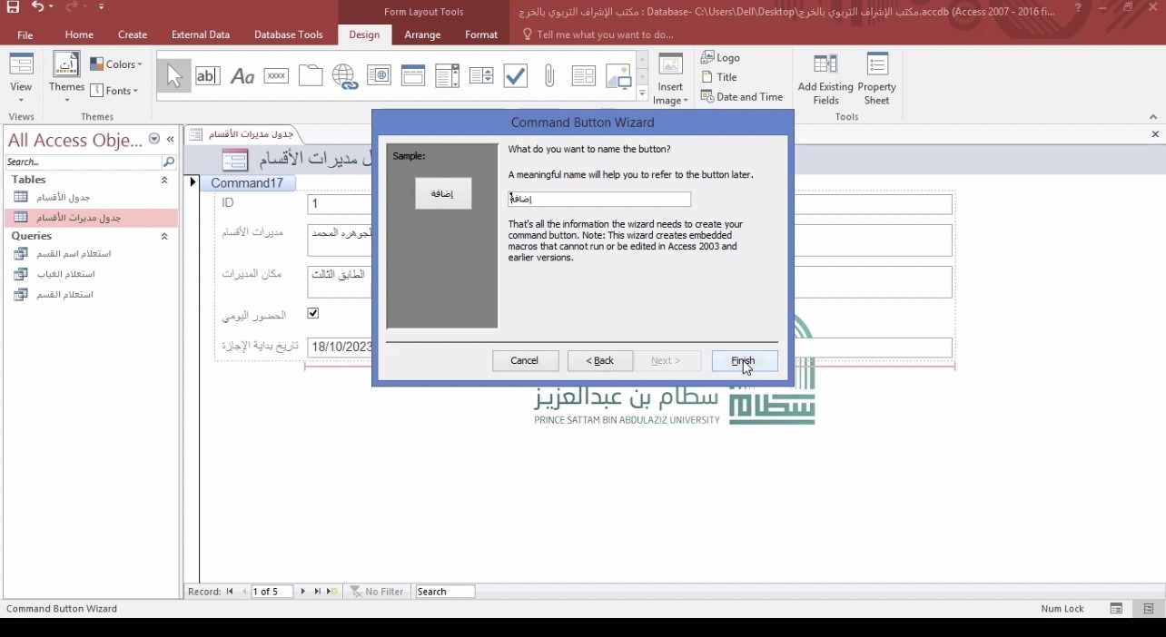 في إطار دور قسم الرياضيات بكلية العلوم والدراسات الإنسانية بالخرج (أقسام الطالبات) في الخدمة المجتمعية والتعاون المستمر بين جامعة الامير سطام بن عبد العزيز والقطاعات الحكومية العامة والخاصة، تم عمل ورشة عمل بعنوان (كيفية انشاء قاعدة بيانات باستخدام برنامج ACCESS)، وذلك يوم الثلاثاء الموافق 27/3/1445هـ من تقديم المحاضر الاستاذة /لطيفة عبد اللطيف صالح الملحم، والتي استهدفت منسوبات مكتب الاشراف التربوي النسائي بتعليم الخرج.