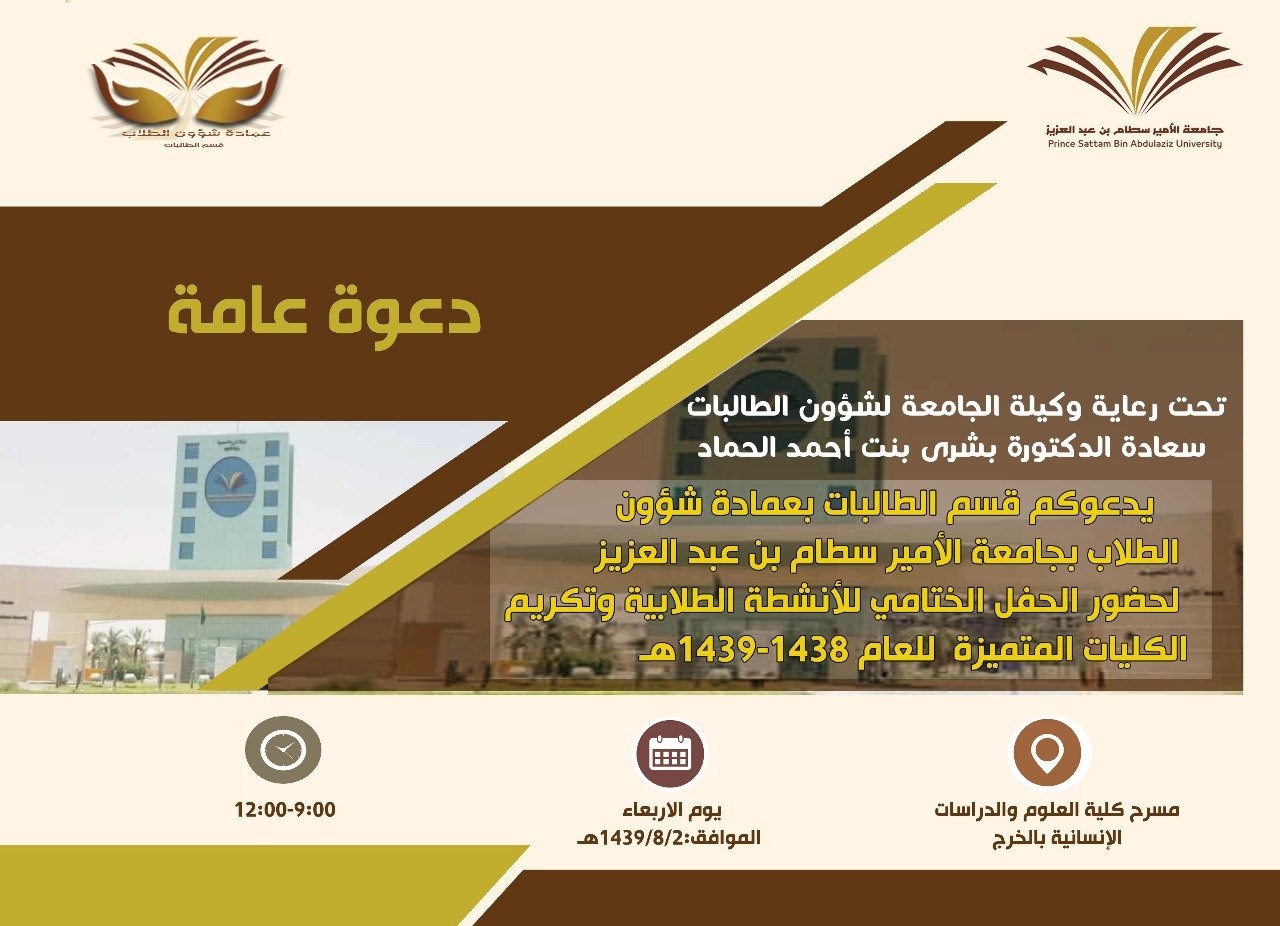 تحت رعاية الدكتورة بشرى بنت أحمد الحماد، وكيلة الجامعة لشؤون الطالبات، ينظم قسم الطالبات بعمادة شؤون الطلاب الحفلَ الختامي للأنشطة الطلابية بالعمادة، على مسرح كلية العلوم والدراسات الإنسانية بالخرج.