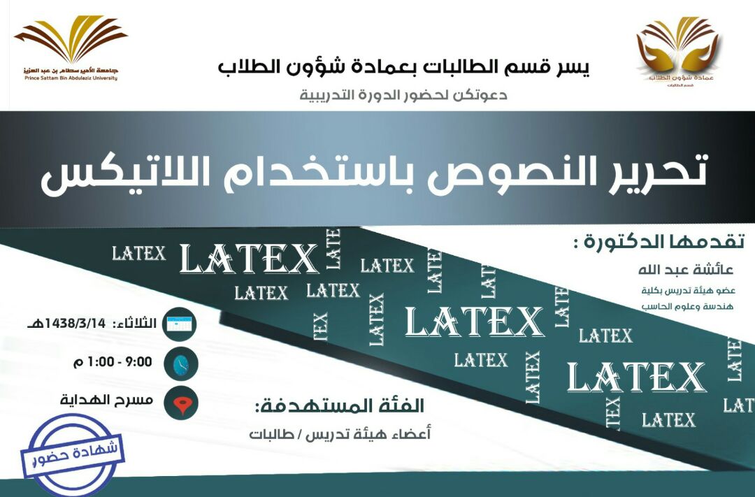 تعقد عمادة شؤون الطلاب ممثلة بقسم الطالبات يوم الثلاثاء 14/3/1438هـ، من الساعة (9.00ص – 1.00م) في مسرح مبنى هداية، دورةً تدريبيةً متخصصةً بكتابة الأبحاث العلمية، بعنوان: "تحرير النصوص باستخدام اللاتيكس". وتشمل الدورة تدريب الباحثات من (الطالبات - وخاصة الخريجات - وأعضاء هيئة التدريس) على استخدام برامج تساعدهن في كتابة الأبحاث، بحيث تركز الباحثة على مضمون الكتابة دون التشتت بالعرض البصري للمعلومة. ويعد برنامج "اللاتيكس" من البرامج التي تهتم بكتابة الأبحاث باللغتين العربية والإنجليزية، ويستهدف متخصصي الأقسام العلمية (حاسب، رياضيات، علوم، هندسة، طب)، ويمكن استخدامه في بحث يعدّ للنشر أيضًا.