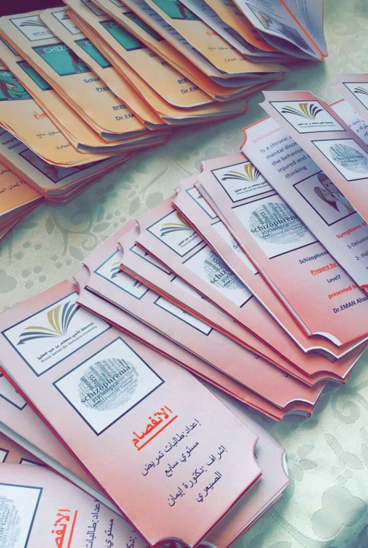 أقامت طالبات المستوى السابع بقسم التمريض وتحت إشراف المحاضرة / إيمان الصيعري فعالية بعنوان (مرض الانفصام) وذلك يوم الخميس 3/30/ 1438هـ بقاعة الأنشطة الطلابية .