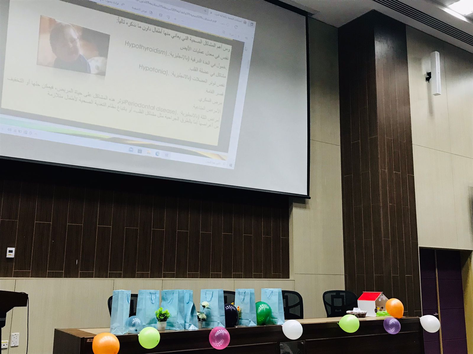 برعاية عميد كلية التربية بوادي الدواسر الدكتور / ياسر مبارك الدوسري ، ورئيس قسم التربية الخاصة الدكتور / فيصل الدوسري وبإشراف الدكتورة / ميرفت عزمي ، نظم قسم التربية الخاصة اليوم الثلاثاء الموافق 19/8/1443هـ فعالية بمناسبة اليوم العالمي لمتلازمة داون وذلك بالتعاون مع مركز عبور للرعاية النهارية لذوي الاحتياجات الخاصة . حيث شارك في الفعالية كلا من أعضاء هيئة التدريس وطالبات القسم ، وبدأت الفعالية بكلمة للدكتورة ميرفت عزمي وضحت من خلالها ما تهدف اليه الفعالية من تعزيز ودمج ذوي متلازمة داون في المجتمع والتواصل معهم بشكل فعال وتحسين نوعية حياة المصابين من خلال تلبية احتياجاتهم وتوفير الرعاية الصحية المنتظمة وأهمية مراقبة النمو العقلي والبدني لهم . كما شارك أعضاء القسم في التعريف بمتلازمة داون وكونها نتيجة اضطراب خلقي وخلل في الصبغيات أو المورثات وزيادة في عدد الكروموسومات، وأيضا اهم السمات والخصائص والقدرات الخاصة بهم وطرق الاستفادة من برامج التدخل المبكر والتعليم الشامل في السعي لتكييف اساليب التواصل معهم . واختتمت الفعالية بكلمة لمشرفة مركز عبور للرعاية النهارية استعرضت من خلالها اهم الخدمات المقدمة لذوي الاحتياجات الخاصة والامكانيات المتاحة لتوفير بيئة صحية واجتماعية ملائمة لهم ، وأخيرا قدم قسم التربية الخاصة الهدايا الرمزية لأطفال متلازمة دوان تقديرا لمشاركتهم في الفعالية .