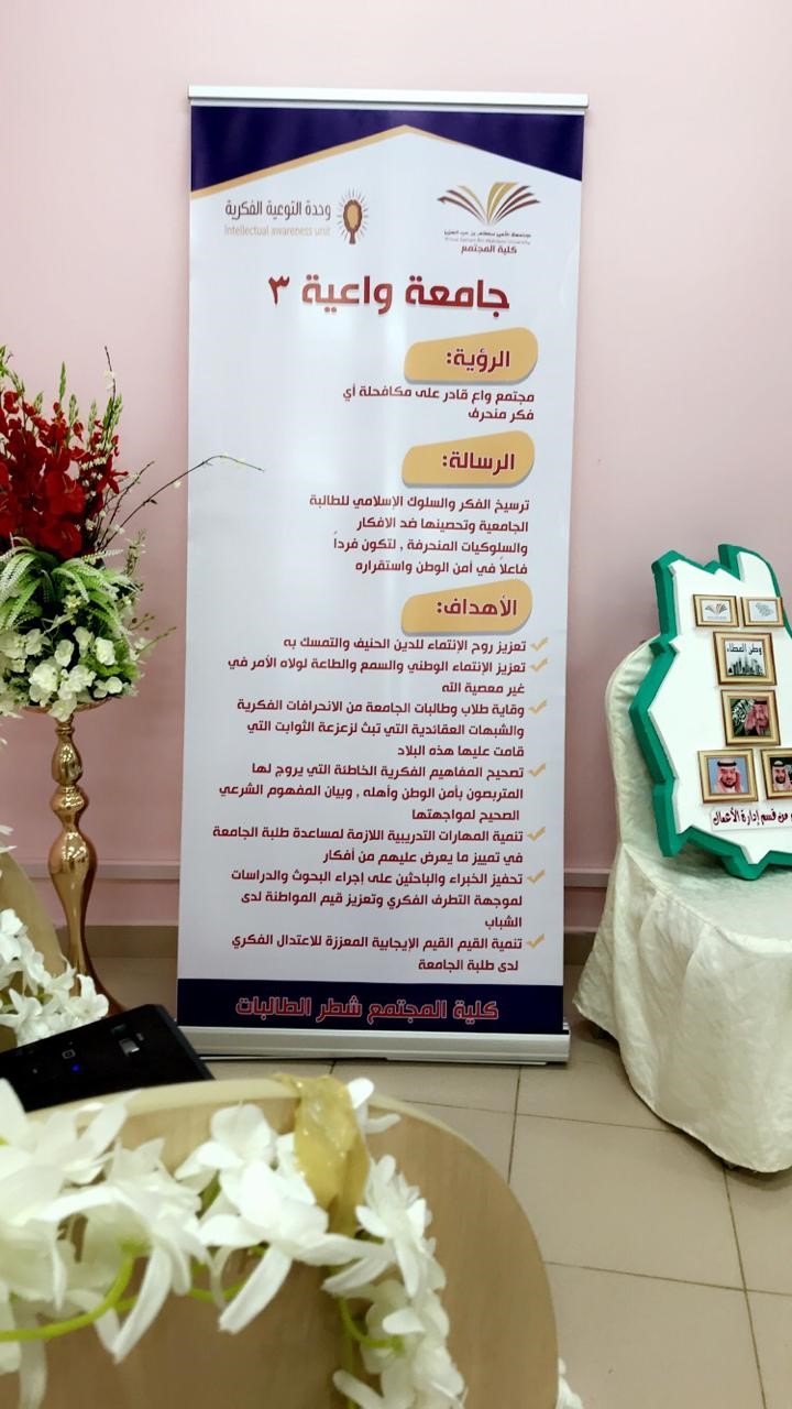 تحت رعاية سعادة وكيلة كلية المجتمع الدكتورة / أمينة عبدالرحمن المشحن. أقامت كلية المجتمع – شطر الطالبات-وبالتعاون مع وحدة التوعية الفكرية وذلك ضمن مشروع "جامعة واعية2" يوم الاثنين الموافق 4/3/1440هـ. حلقة نقاش بعنوان "قيم فكرية " من تقديم سعادة الدكتورة / نورة عبدالله الغملاس . وقد تناولت الدكتورة في الحلقة عدد من المحاور من أهمها تعريف القيم والأمن الفكري وكيفية تعزيز وتنمية القيم الفكرية وتحصين الفرد والمجتمع من الغزو الفكري المنتشر في الآونة الأخيرة كذلك تحدثت الدكتورة عن الوسطية والعدالة والمساواة والانتماء وحب الوطن. وقد شارك طالبات الكلية بالنقاش وطرح الأفكار وابتكار أساليب وطرق لتعزيز القيم وتطوير الذات لدعمها وتطبيقها على الفرد والمجتمع.