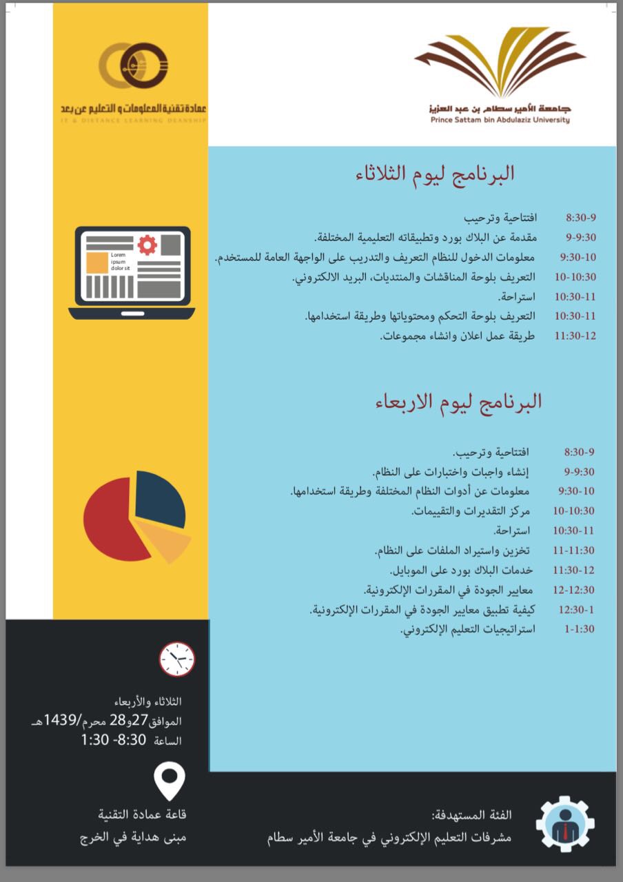 برعاية من سعادة الدكتور عبدالله بن عبدالعزيز البهدل افتتحت عمادة تقنية المعلومات والتعليم عن بعد مبادرتها " رائدات التعليم الإلكتروني" بورشة عمل حول "مهارات التعليم الإلكتروني من خلال البلاك بورد" وذلك يوم الثلاثاء الموافق 27/1/1439هـ و استمرت على مدار يومين في قاعة العمادة للتدريب بمبنى العمادات المساندة "هداية "، حيث كانت الورشة مخصصة لإعداد وتأهيل وتدريب منسقات التعليم الإلكتروني بالكليات بالجامعة وقد قدمت الورشة سعادة الدكتورة تهاني الدسيماني وكيلة عمادة تقنية المعلومات والتعليم عن بعد وتناولت الورشة في يومها الأول عدداً من المحاور الهامة حول التعليم الإلكتروني و أهدافه ومميزاته وتطبيق عملي لنظام إدارة التعلم الإلكتروني "بلاك بورد". وفي يومها الثاني , ناقشت استراتيجيات التعليم الإلكتروني و أنواعها و معايير الجودة QM للمقررات الإلكترونية. وقد تخلل الورشة عدد من المناقشات الهادفة لتفعيل وتعزيز التعليم الإلكتروني في الجامعة و دور أعضاء هيئة التدريس والطلاب في تعزيز ذلك. وفي ختام الورشة تم تزويد منسقات الكليات بالحقائب التدريبية الخاصة بالورشة لإعادة تطبيقها في كليات الجامعة