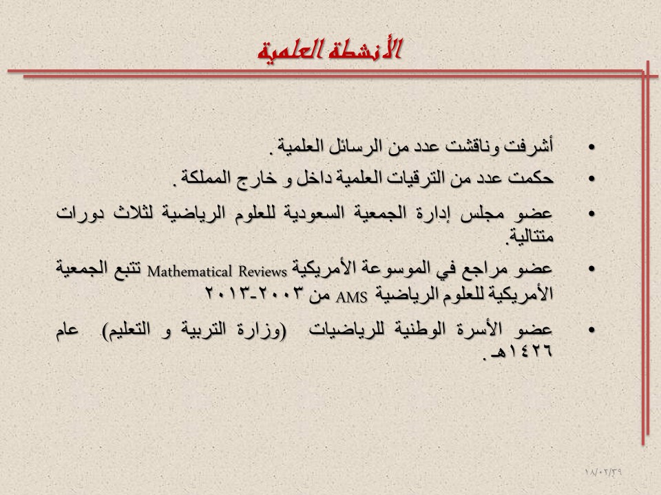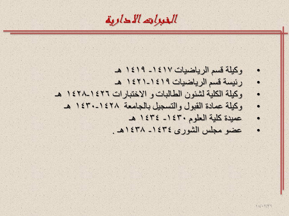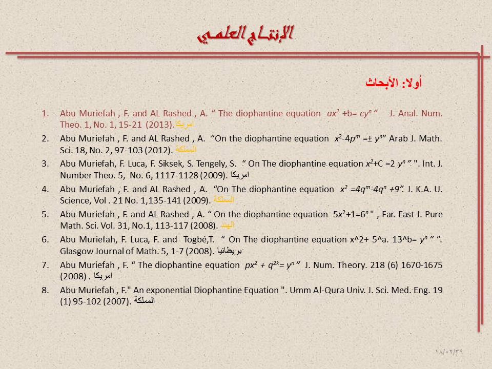 وقد تم نشر خمسة أبحاث منها اثنين في الولايات المتحدة و الثالث في استراليا و الرابع في المملكة المتحدة و الخامس في الهند. و تعتبر أ. د. فدوى أول متخصصة في مجال نظرية الأعداد في المملكة العربية السعودية ، كما تناولت سعادتها بعضاً من أبحاثها التي نشرت عالميا لحلها للعديد من المعادلات الرياضية الجديدة و قد كان بعض الأبحاث مشتركة و أخرى كانت أبحاث مفردة.. ثم اعطت سعادتها نبذة مختصرة عن كتابيها (أسس الرياضيات ) و( التحليل الحقيقي) و هي كتب للمرحلة الجامعية .. وقد استمتع الحاضرون بتجربة أ.د/ فدوى في الكتابة الصحفية و اصدارها كتاب أدبي بعنوان ( رحلتي مع صغيري الفهد) ، ثم تحدثت أخيرا عن تجربتها في مجلس الشورى حيث أنها كانت ضمن أول تمثيل للمرأة في المجلس وذكرت كيف كان للعمل البرلماني من تأثير على خبراتها العملية .