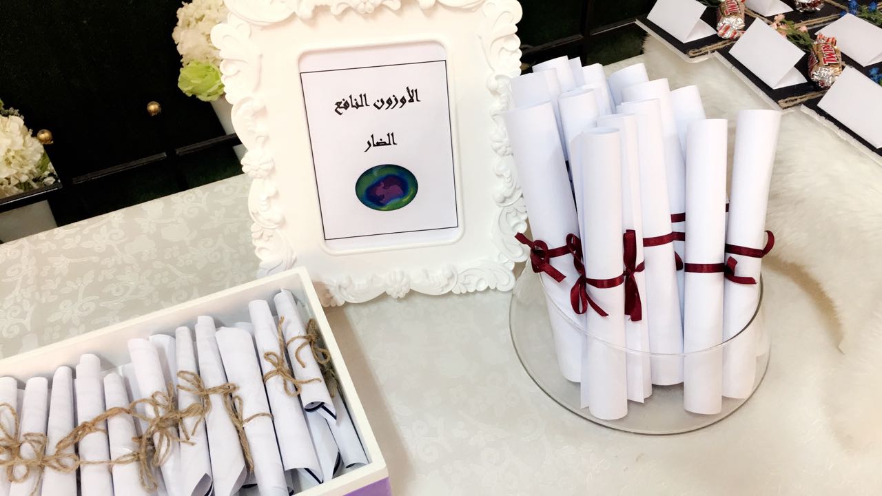 تحت رعاية عميدة كلية العلوم والدراسات الإنسانية بحوطة بني تميم الدكتورة حصة بنت سعود الهزاني، وبالتعاون مع وحدة العمل الطلابي أقام قسم الكيمياء ركن بعنوان (الأوزون النافع الضار) يوم الإثنين الموافق 23 / 3 / 1439 هـ في تمام الساعة ٩:٣٠ صباحًا بساحة الكلية. شرح العديد من الطالبات مالمقصود بالأوزون واستخدامات الأوزون في الصناعة ومنافع الأوزون وأضراره وعبروا بذلك بالصور والتوزيعات سائلين الله عز وجل أن ينفع بما قدموا .