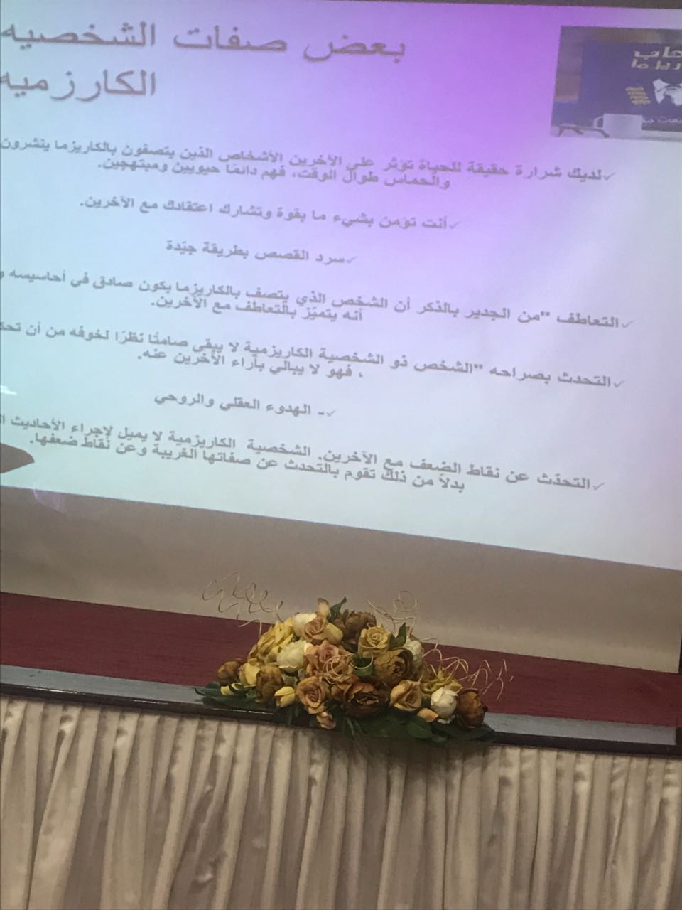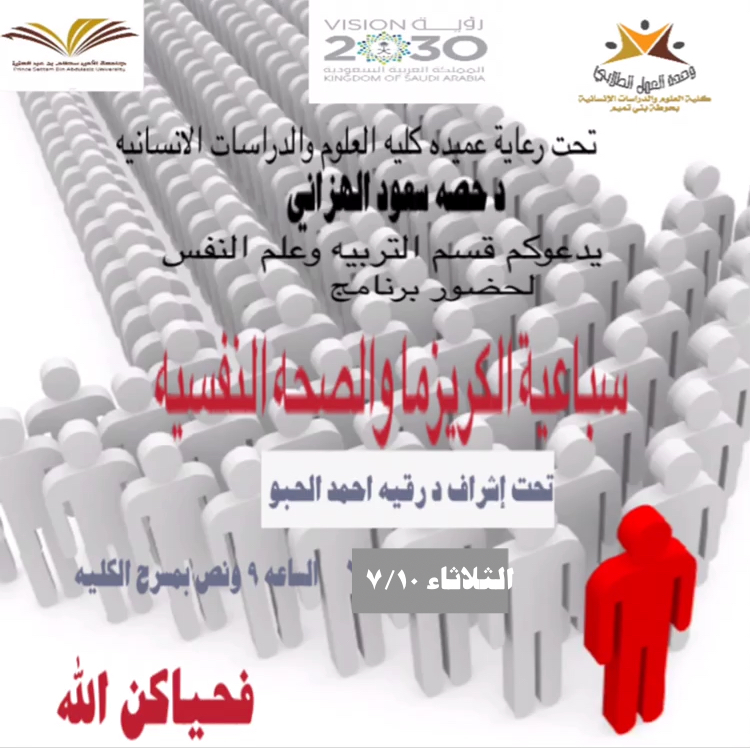 تحت رعاية عميدة كلية العلوم والدراسات الإنسانية بحوطة بني تميم الدكتورة حصة سعود الهزاني أقام قسم التربية وعلم النفس برنامج (سباعية الكاريزما والصحة النفسية) بإشراف د. رقيه أحمد الحبو يوم الثلاثاء ٧/١٠ / 1439 هـ. هدف البرنامج إلى التعريف بالشخصية الكاريزمية وهي الشخصية الجاذبية المقنعة التي لديها ألقوه الغامضة لجذب الآخرين وهي من الصفات التي يسعى كثير من الناس لاكتسابها، كما تم عرض مقطع فديو يتحدث عن الصحة النفسية وكيف ممكن للشخص التخلص من الضغوطات النفسية وكيف تكون شخصية كارزمية وقدرة الإيجابية للإقناع وزرع الثقة بالنفس. صاحب البرنامج ركناً خارجياً حوى توزيعات ومنشورات وعبارات عن سباعية الكاريزما وقد لاقى البرنامج إعجاب الحضور .