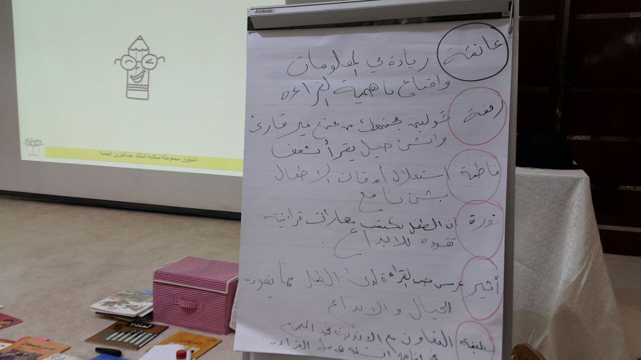كما تم تزيد كل متدربة بحقيبة تحتوي على مجموعة قصصية للأطفال من عمر 2-5 سنوات, 6- 8 سنوات, 9-12سنة, 13-15سنة مرفقةً بدليل مرشد يساعدهن على تنفيذ مشاريعهن حيث تم توكيلهن بنشر ثقافة القراءة للطفل في بيئات المجتمع المختلفة داخل الأسرة في التجمعات العائلية وفي الحدائق والمرفقات العامة واستثمار الفعاليات المختلفة في المحافظة والتي عادة ما يكثر فيها وجود الأطفال في هذا العمر.