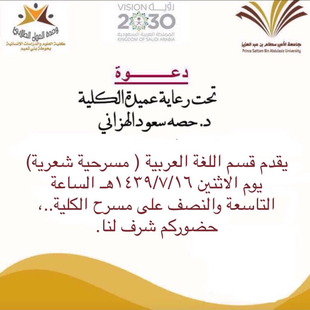 نظم قسم اللغة العربية بكلية العلوم والدراسات الإنسانية بحوطة بني تميم مسرحية شعرية بعنوان شريعة الغاب لأحمد شوقي يوم الأحد 15 / 7 / 1439 هـ في مسرح الكلية. تم تقديم مسرحية رمزية، تتناول قصّة أحداث موطن يعمّه الفوضى وسوء السلطة، وجاءت على ألسنة الحيوانات بمختلف أنواعها، ومنح كلّ حيوان من هذه الحيوانات دوراً يشير إلى منصب أو عضو في أعضاء السلطة الحاكمة، وهي مستوحاة من الواقع وتهدف إلى معالجة قضايا الأمة. حضر البرنامج في المسرح سعادة عميدة الكلية الدكتورة حصة الهزاني وعدد من أعضاء التدريس والإداريات وقد لاقت استحسان الحضور.