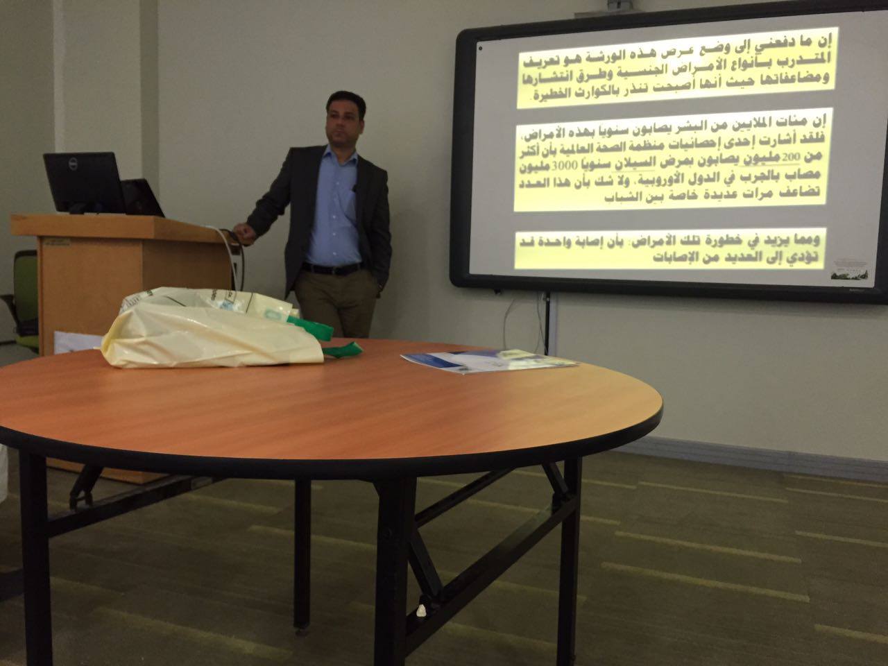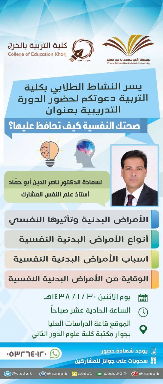 أقامت كلية التربية بالخرج دورة تدريبية بعنوان (كيف تحافظ على الصحة النفسيّة والبدنيّة)، أمس الاثنين 30/1/1438هـ، قدّمها الدكتور ناصر الدين أبو حمّاد أستاذ علم النّفس المشارك بالكليّة، حيث تناول أبو حمّاد الأمراض البدنيّة وتأثيرها النفسي، وأنواع هذه الأمراض، وأسبابها، والوقاية منها.