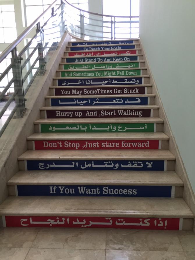 قام كل من الطالبين نايف سعيد الشهراني وعبدالعزيز جريد الحربي بعمل ملصقات على درج الكلية كأحد المشاركات الإبداعية في الأنشطة الطلابية، وهذه الملصقات تحتوى على عبارات تحفيزية للطلاب تدعوهم إلى التقدم وتنمية الشخصية والصبر والمثابرة وتحقيق الذات. ولمثل هذه الأعمال دور كبير في زيادة الدافعية لدى الطلاب وحثّهم على تحقيق النجاح كما قد تكون دافعًا لهم لصعود الدرج وترك المصاعد وبهذا يكون لها دور أيضا في الصحة البدنية للطلاب.