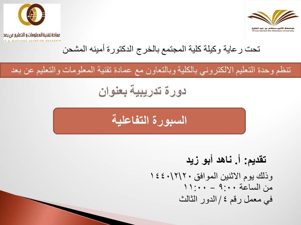تحت رعاية سعادة وكيلة كلية المجتمع الدكتورة/ أمينة عبدالرحمن المشحن . وبالتعاون مع عمادة تقنية المعلومات والتعليم عن بعد نظمت وحدة التعليم الالكتروني بكلية المجتمع تحت إشراف الأستاذة /مراحب الرشيدي . منسقة وحدة التعليم الإلكتروني في الكلية . سلسلة دورات تدريبية لأعضاء هيئة التدريس حول استخدام أدوات التعليم الإلكتروني حيث قدمت الأستاذة /ناهد أبو زيد .دورة حول استخدام السبورة التفاعلية وذلك يوم الاثنين الموافق 20\2\1440هـ
