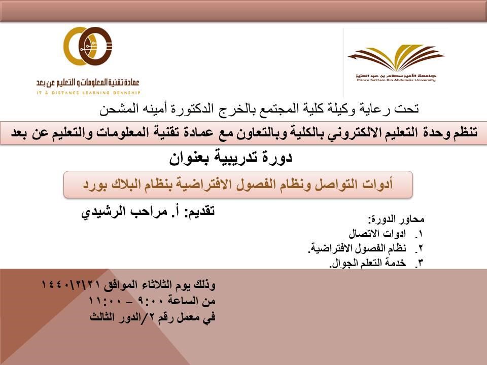 وكذلك قدمت الأستاذة/ مراحب الرشيدي يوم الثلاثاء الموافق 21\2\1440هـ دورة تدريبية حول استخدام الفصول الافتراضية بنظام البلاك بورد .