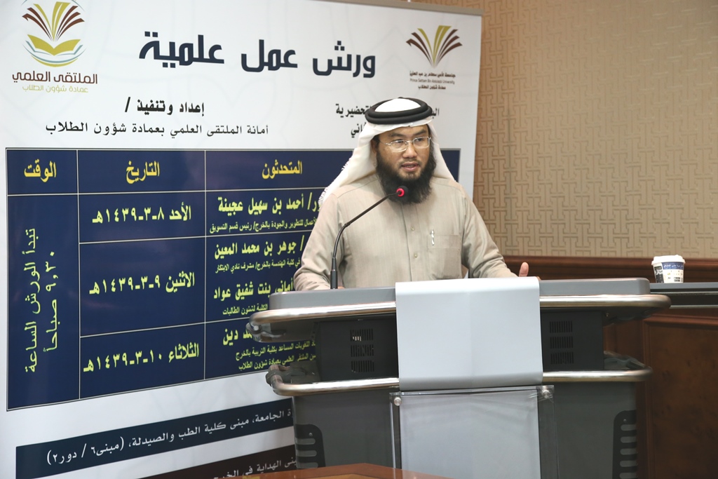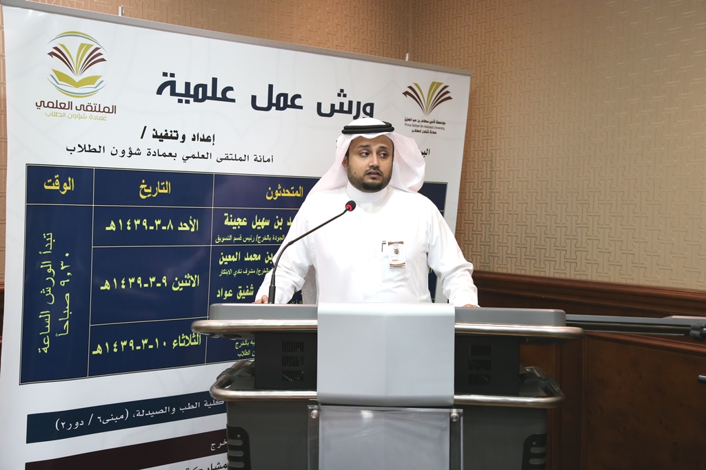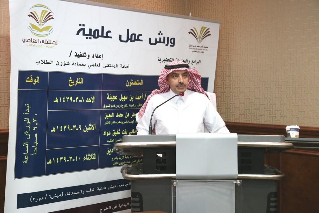 أقامت عمادة شؤون الطلاب ممثلة في أمانة الملتقى العلمي واللجنة العليا للملتقى ورشة عمل علمية بعنوان (صناعة الأعمال والاقتصاد) في قاعة تدريب كبار الشخصيات بإدارة الجامعة وتم الربط الشبكي مع الطلاب والطالبات في قاعة الهداية بالخرج وقاعات التدريب للجامعة في فروعها بالحوطة و الافلاج و السليل ووادي الدواسر ، كان المتحدث فيها سعادة الدكتور / أحمد بن سهيل عجينة وكيل كلية إدارة الأعمال بالخرج للتطوير والجودة ، حضر الورشة بعض أعضاء هيئة التدريس و بعض الطلبة المشاركين في هذا المحور من الملتقى العلمي.