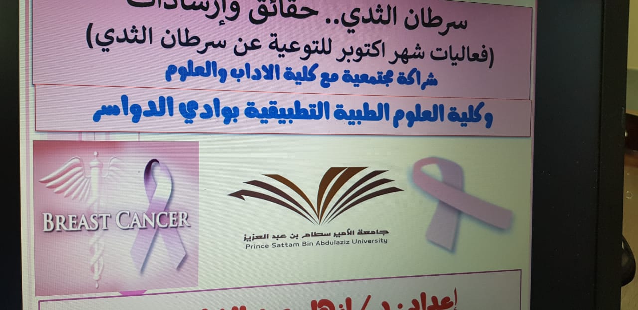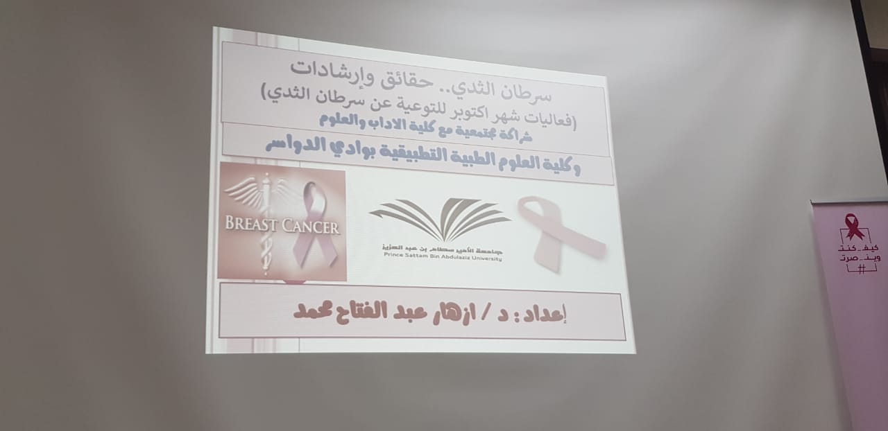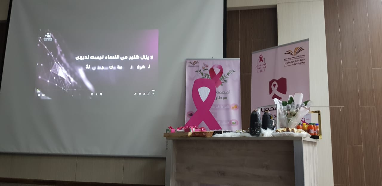 هدفت الفعالية إلي رفع مستوى الوعي العام بمرض سرطان الثدي. وقد تم تقديم محاضرة توعوية "سرطان الثدي .. حقائق و إرشادات»" قدمتها سعادة: الدكتورة أزهار عبدالفتاح محمد (أستاذ مساعد بقسم التمريض)، و أهم ما تناولته: معدلات الإنتشار ونسبة الحدوث بالمملكة، الأسباب وعوامل الخطورة، أهمية الكشف المبكرلسرطان الثدي، المفاهيم الخاطئة عن سرطان الثدي وتم عرض فيديوهات توعوية . أيضا تم المشاركة ببرشور للتوعية بسرطان الثدي من قبل الدكتورة الدكتورة ماجدة محمود الجميل (أستاذ مشارك بقسم التمريض) وبوستر بعنوان غذاؤك هو حياتك. وقد لاقت الفعالية استحسان وترحيب من الحضور.