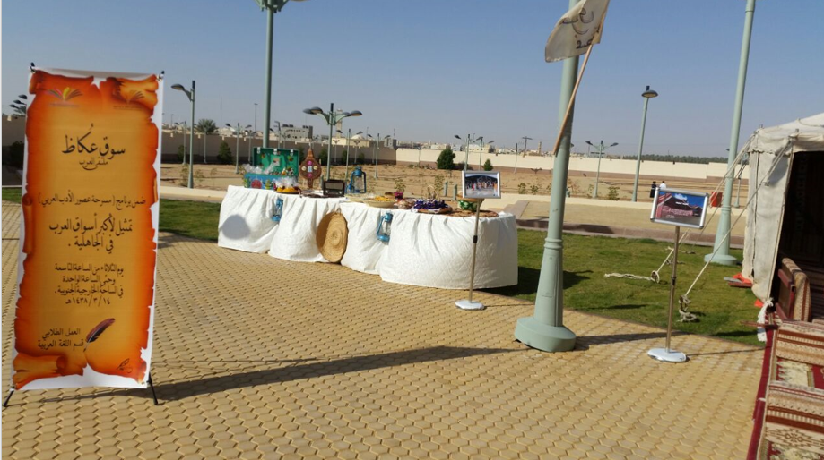 ضمن برنامج (مسرحية عصور الأدب العربي) نظم قسم اللغة العربية بالتعاون مع وحدة العمل الطلابي نشاط عن سوق عكاظ ملتقى العرب تحت إشراف د.شريفة آل طالب و أ.أمل الموسى ، يوم الثلاثاء الموافق 14/3/1438هـ من الساعة 9 وحتى الساعة 1 ظهراً، بالساحة الخارجية الجنوبية بالكلية .
