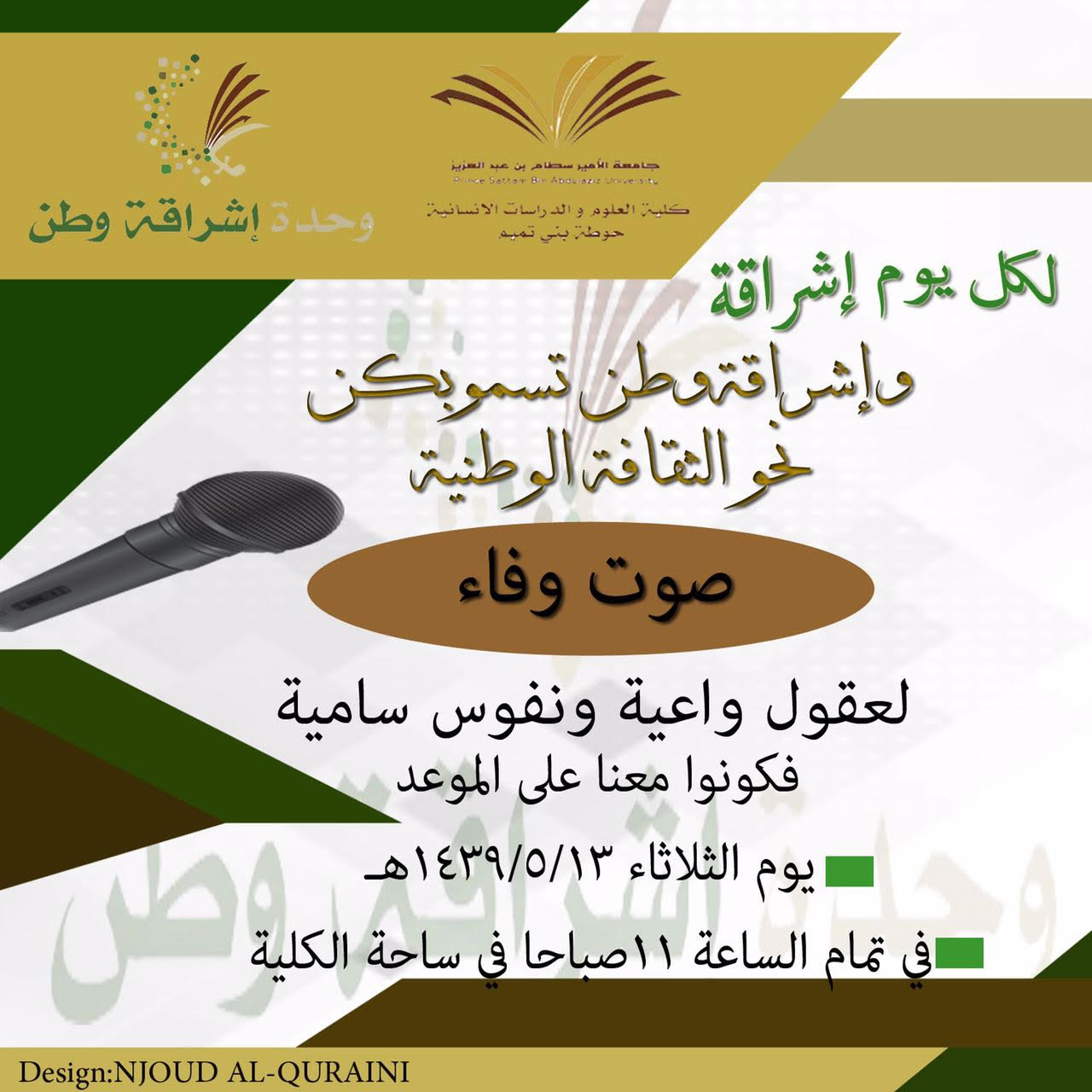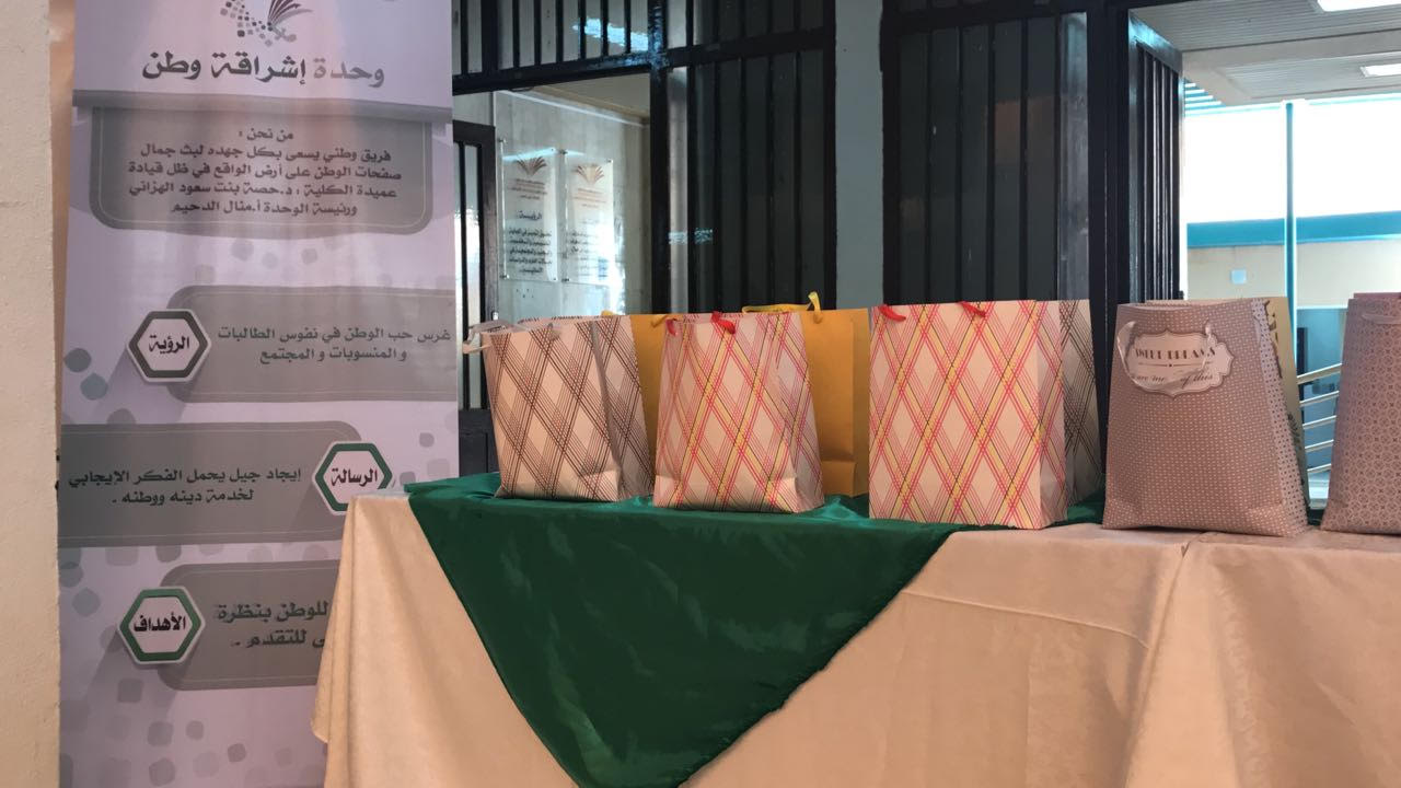 اشراقة صباح ملبد بالسحب تشرق فيه ارواح مواطنه تسعى للشروق والآمال لتنفذ وحدة اشراقة وطن (صوت وفاء) في يوم الثلاثاء الموافق 13 / 5 / 1439 هـ بتمام الساعة الحادية عشرة صباحاً، تحت قيادة عميدة الكلية الدكتورة حصة بنت سعود الهزاني وبإشراف رئيسة الوحدة ا/منال الدحيم وفريق الوحدة. كان لقاء الطالبات والمنسوبات في ساحة الكلية فصدحت الأناشيد الوطنية وبدأت المسابقات الوطنية الحركية في جو تفاعلي مع الطالبات وقد كانت مواهب الطالبات في الخط لأجمل عبارة عن الوطن وتفعيل العلم الوطني وأهميته والفخر به والتذكير بالأمن والأمان الذي نحظى به وقد تكلل البرنامج بانتظار الطالبات تكرار مثل هذه اللقاءات لإضفاء اجواء من المتعة والفائدة.