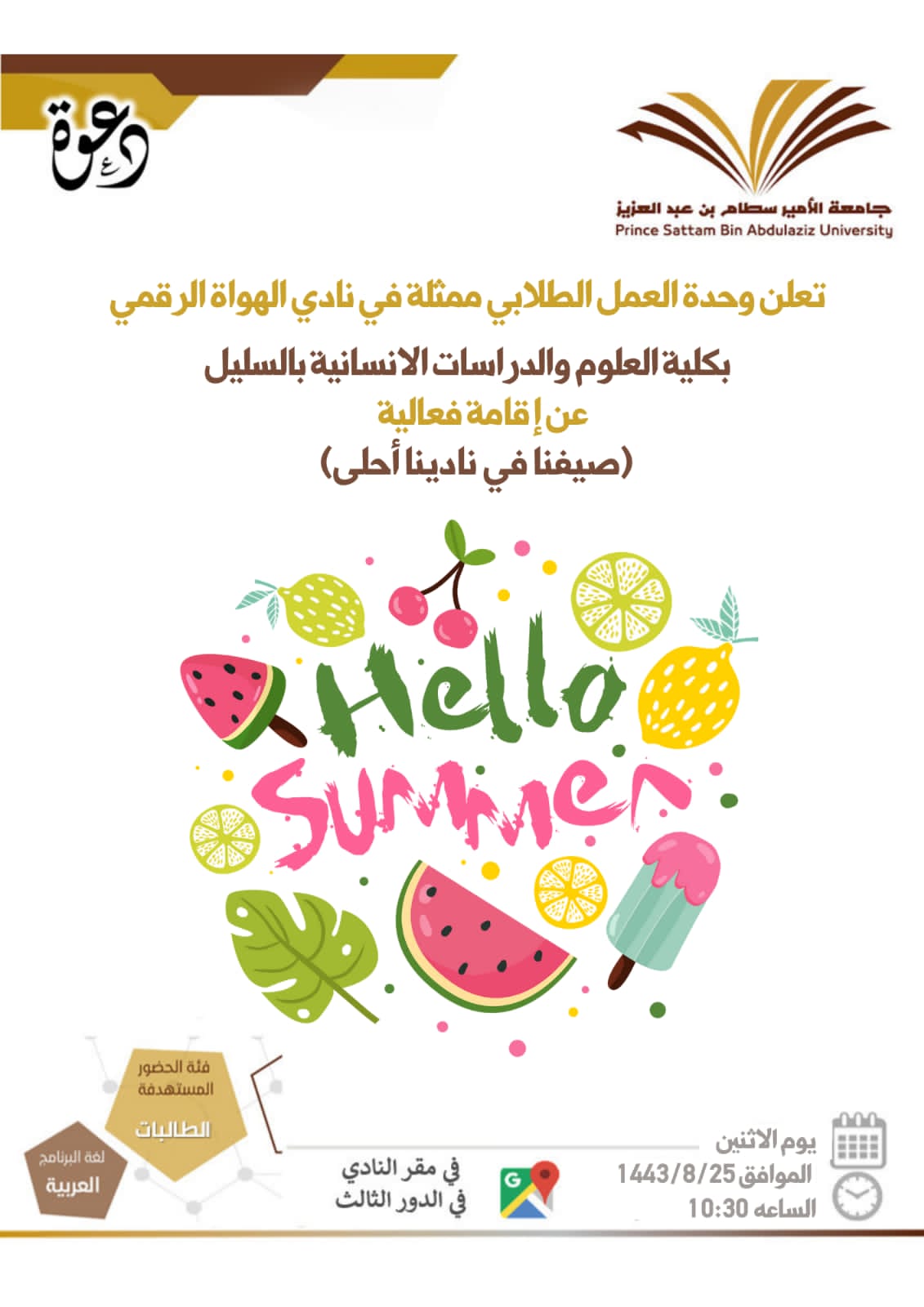 من باب كسر الروتين وتجديد الحماس لأعضاء النادي اقام نادي الهواة الرقمي الفعالية الصيفية ( صيفنا في نادينا غير ) برنامج ترفيهي موجة لطالبات الكلية والاعضاء وحيث اجتمع اعضاء النادي مع وكيلة الكلية الدكتورة / عواطف بنت نصار الرشيدي ومشرفة النادي / رجساء الظافر وذلك من اجل طرح المواضيع الخاصة بالنادي وطرح أفكارهن الابداعية وخبراتهن في النادي والدورات التي عرضت من قبلهن وما يطمحن اليه من تميز ورغبه في الوصول للتميز والريادة على مستوى الأندية الطلابية في الجامعة وفي نهاية الفعالية شكرت الأستاذة رجساء الظافر أعضاء النادي على جهودهن المبذولة لا نجاح هذه الفعالية.