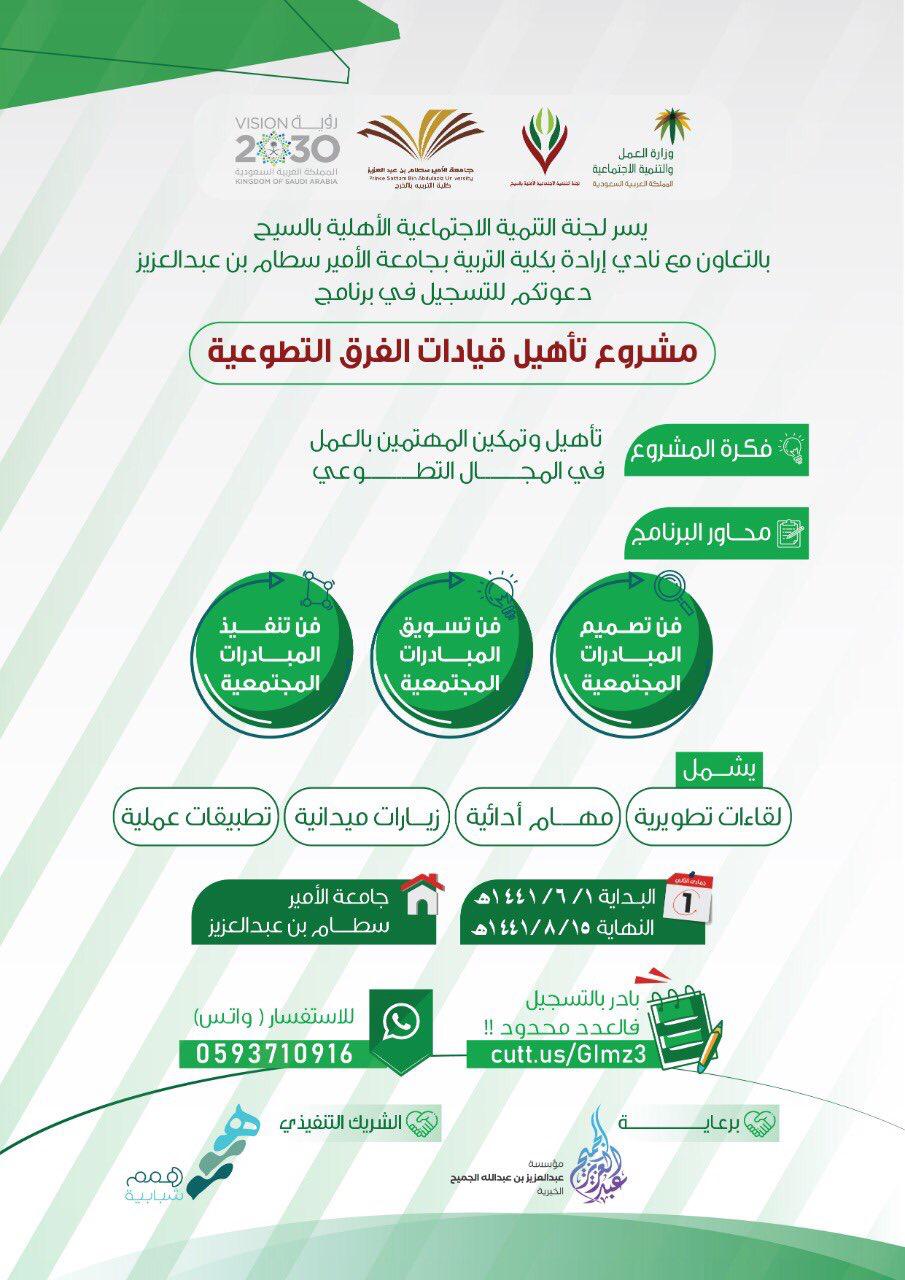 اطلق نادي إرادة مساء امس مشروع تأهيل قيادات الفرق التطوعية بالتعاون بين #نادي_إرادة ولجنة التنمية الاجتماعية الأهلية بالسيح في تمام الساعة ١٢-١ ظهراً وذلك في مسرح كلية التربية بالخرج حيث تواجد ممثل الجمعية الفقهية الدكتور أحمد الشثري وتحدث عن محور مهم ألا وهو الأحكام الفقهية المتعلقة بالمتطوع