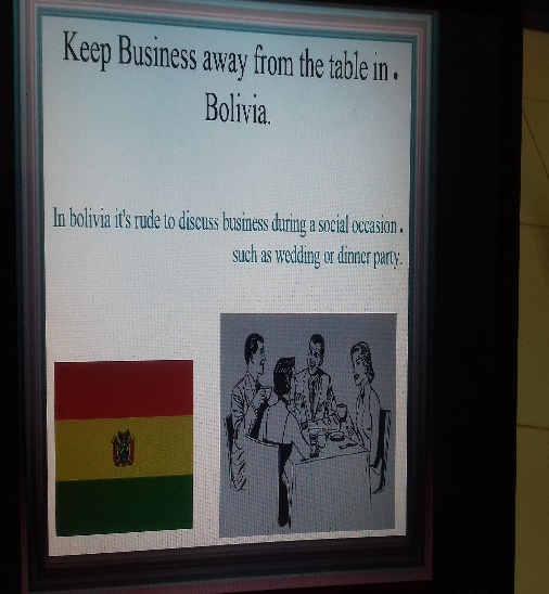 برعاية وكيلة السنة التحضيرية الدكتورة منى الدوسري وبحضور عدد من أعضاء هيئة التدريس، قامت طالبات قسم الهندسة مجموعة 16 (G16) بإشراف أستاذة اللغة الانجليزية: الدر محمد، باختيار مجموعة من دول العالم التي عُرف عنها غرابة عاداتها وقُمن بالتعريف بحضارات تلك الدول وشرح عاداتها وتقاليدها، موظفين اللغة الانجليزية في حديثهن عن طريق عرضًا تقديمًا شمل أبرز العادات والتقاليد لتلك الدول. وقد لاقى الركن إعجاب الحضور لما حواه من معلومات ممتعة وغريبة.