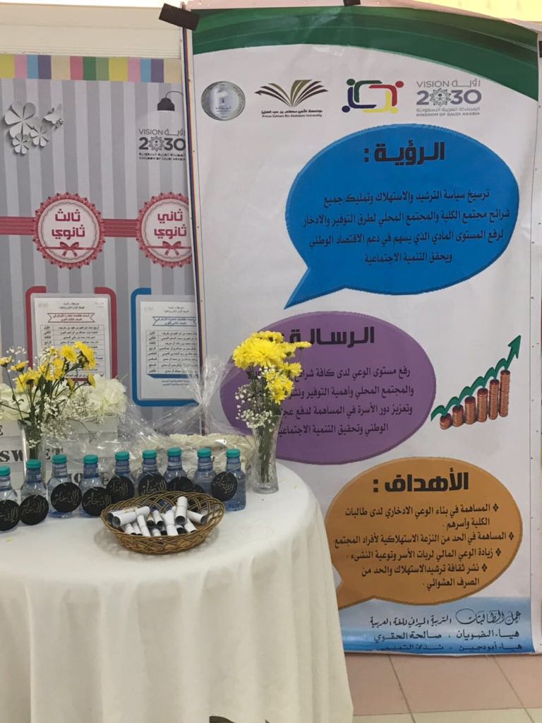 تماشياً مع حملة الادخار المنظمة على مستوى الجامعة، أقامت وحدة الخدمة المجتمعية بكلية العلوم والدراسات الإنسانية بحوطة بني تميم وطالبات التربية الميدانية بقسم القران الكريم والدراسات الإسلامية تحت إشراف الدكتورة - انتصار فتح الرحمن سليمان محمد - برنامج ( أصرف بحكمة ) بمدرسة متوسطة وثانوية تحفيظ القرآن الكريم بالحلوة. كان ذلك في يوم الأثنين الموافق ١٦- ٧- ١٤٣٩ هـ، حيث شمل البرنامج التوعية بأهمية الادخار والصرف المادي بحكمة، كما شمل إقامة ركن حوى توزيعات ومنشورات تدعو إلى الحرص على الصرف بحكمة والادخار ونبذ الإسراف، وقد نال البرنامج اعجاب واستحسان الجميع .
