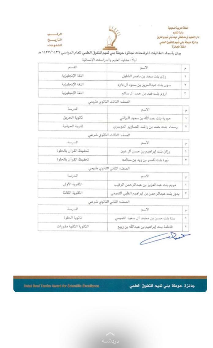 وتم تكريمهن في احتفال حوطة بني تميم بحضور أمير منطقة الرياض صاحب السمو الملكي الأمير فيصل بن بندر بن عبدالعزيز وذلك في صباح يوم الخميس الموافق ٥/ ٥/ ١٤٣٨هـ بقاعة الاحتفالات التابعة لبلدية محافظة حوطة بني تميم بالسلامية، وتم تسليم الجوائز لأولياء أمور الطالبات.