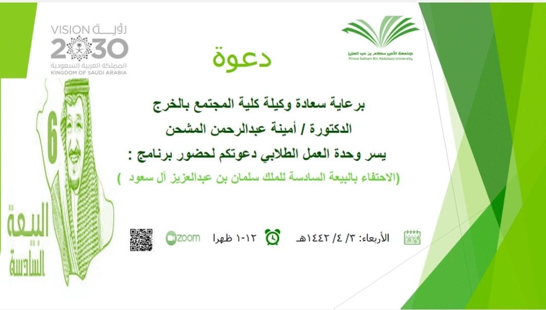 تحت رعاية سعادة وكيلة كلية المجتمع بالخرج د/ أمينة عبدالرحمن المشحن، نظمت وحدة العمل الطلابي بالكلية يوم الأربعاء الموافق ٣/ ٤/ ١٤٤٢ه وبإشراف الأستاذة / ناهد ابو زيد وتنسيق الأستاذة/ أفنان فهد الرفاعي؛ والدكتورة / رفيدة قمر الدولة محمد؛ برنامج احتفالي بذكرى البيعة السادسة للملك سلمان بن عبد العزيز حفظه الله ورعاه - عبر برنامج الزوم- وقد احتوى البرنامج على مجموعة من الفقرات حيث: ابتدأت بالقرآن الكريم ثم السلام الملكي ثم بمقدمة عن بيعة الملك وأثرها العظيم في نفوس الشعب السعودي.