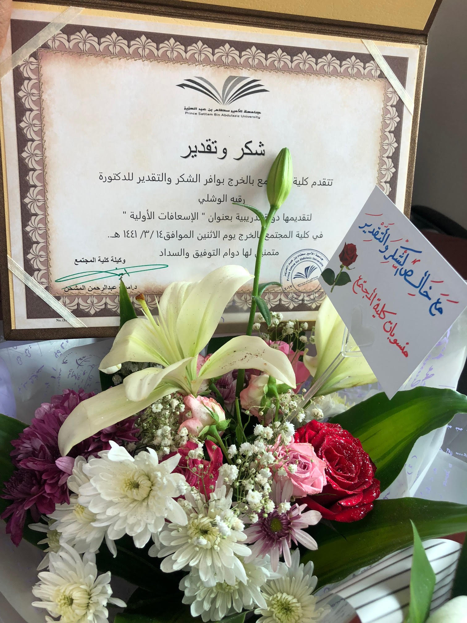 وفي نهاية البرنامج التدريبي تقدمت سعادة وكيلة كلية المجتمع بالخرج الدكتورة / أمينة بنت عبد الرحمن المشحن؛ بخالص شكرها وتقديرها للدكتورة رقية الوشلي على تقديمها البرنامج التدريبي وكآفة الفريق المشارك في البرنامج التدريبي من المستشفى الجامعي كذلك تقدمت بشكرها لوحدة العلاقات العامة والإعلام بكلية المجتمع لجهودهم المتميزة المقدمة لمنسوبات الكلية متمنية لهم المزيد من التوفيق والنجاح .