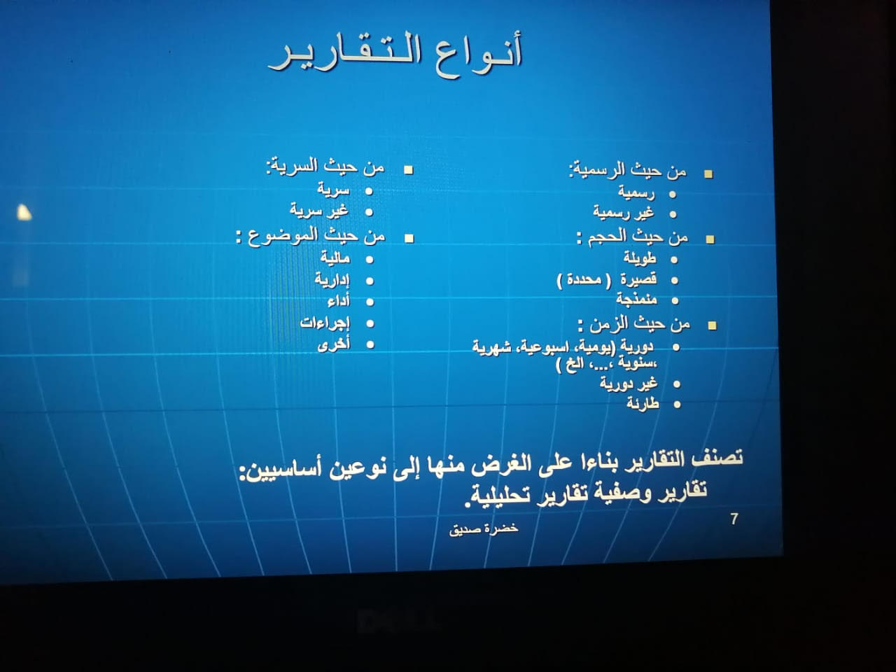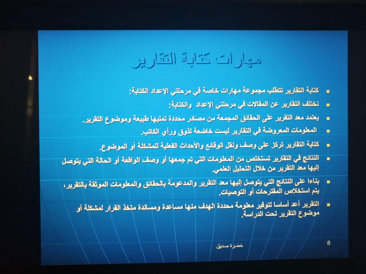 وقد تناولت الدكتورة خضرة في الدورة التدريبية تعريف التقرير وانه عرض للحقائق الخاصة بموضوع محدد عرضاً تحليلياً للوصول لقرار يخدم الموضوع ثم تناولت بالتفصيل أنواع التقارير من حيث كونها رسميه ومن حيث الحجم ومن حيث الزمن ومن حيث السرية ومن حيث الموضع؛ تم تناولت بعد ذلك أهم دواعي كتابة التقرير والمهارات المستخدمة في كتابة التقارير؛ وسمات التقارير الجيدة.