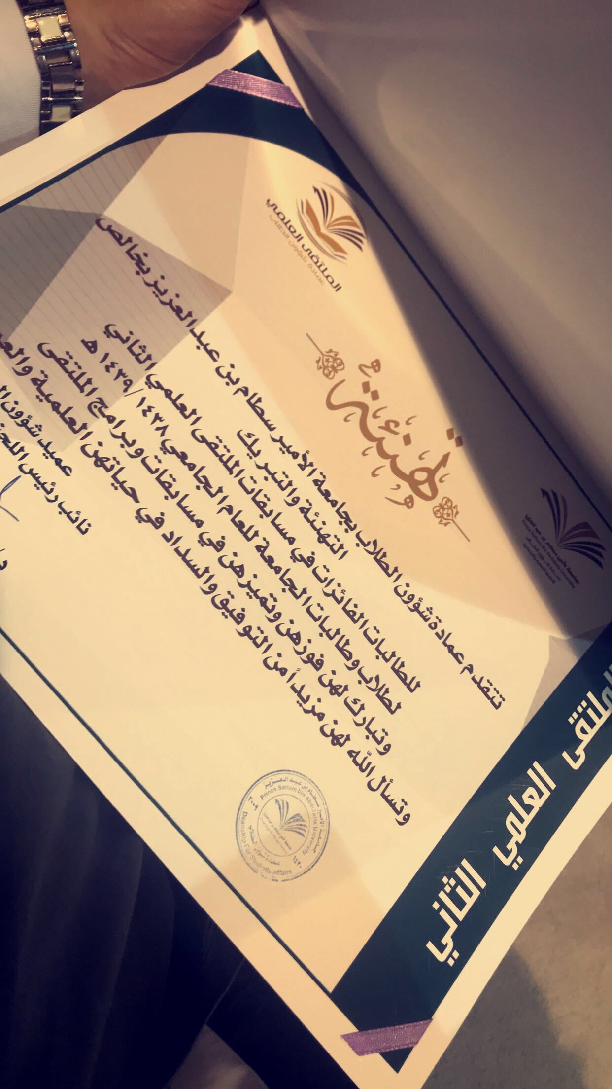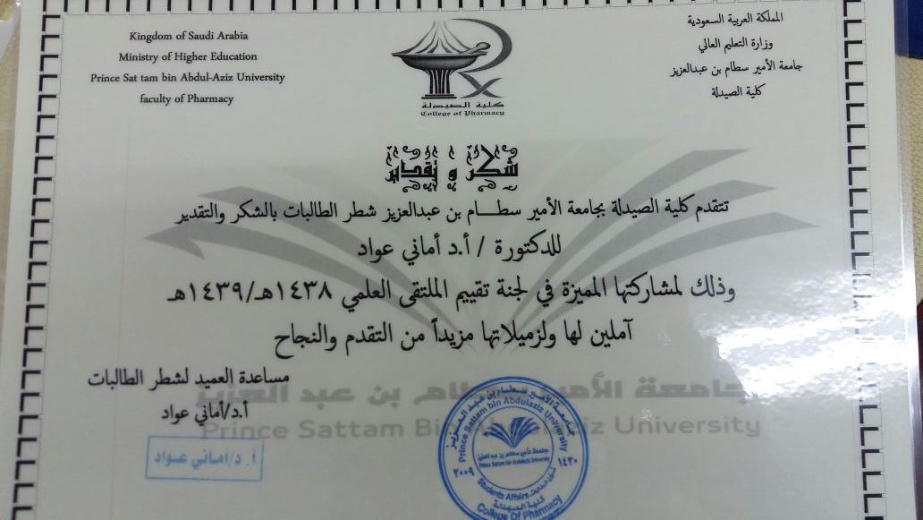 حققت كلية الصيدلة شطر الطالبات مراكز متقدمة في الحفل الختامي للملتقى العلمي الثاني الذي نظمته عمادة شؤون الطلاب وذلك يوم الخميس الموافق 27/6/1439ه في مسرح مبنى الهداية والذي كان بحضور وكيلة الجامعة لشؤون الطالبات ، وعميدات الكليات ووكيلاتها، وعدد من أعضاء هيئة التدريس، وطالبات الجامعة، حيث حققت طالبات كلية الصيدلة في مسار الإبتكارات المراكز الثلاث الأولى فقد حصل على المركز الأول ابتكار عن "فعاليات نبات سبط المهدب عن خلايا السرطانية " إعداد كلا من الطالبات : نورة القرين – هياء الكنهل